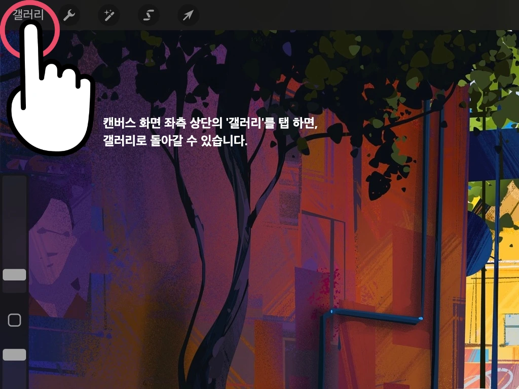 캔버스 화면 내부 기능별 설명은 다음 장에서 하나씩 알아보기로 하고, 우선은 좌측 상단의 갤러리를 탭 해서 다시 갤러리 화면으로 돌아갈게요.