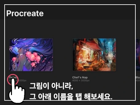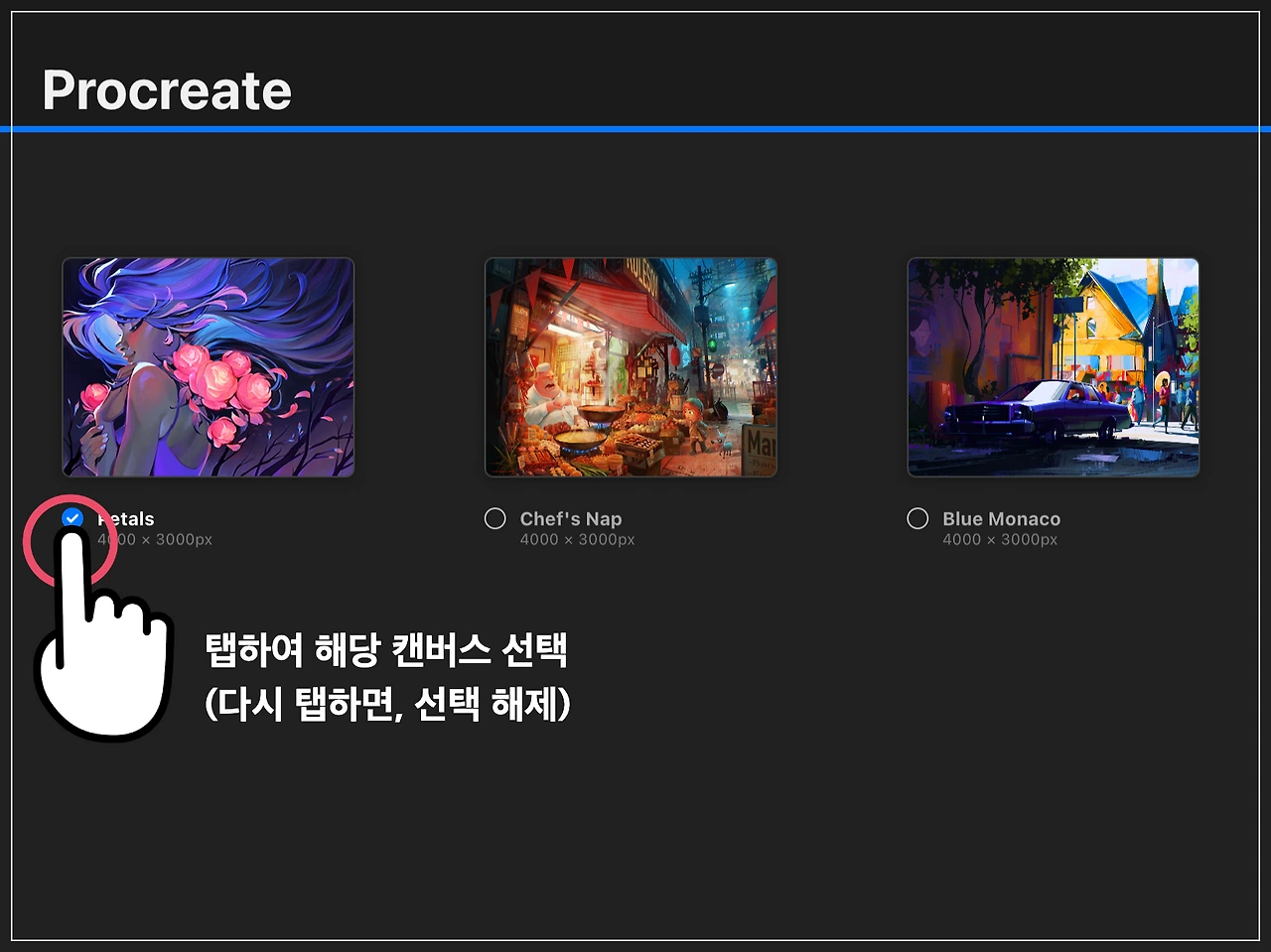 ○를 탭 하면, 해당 캔버스를 선택하게 됩니다.