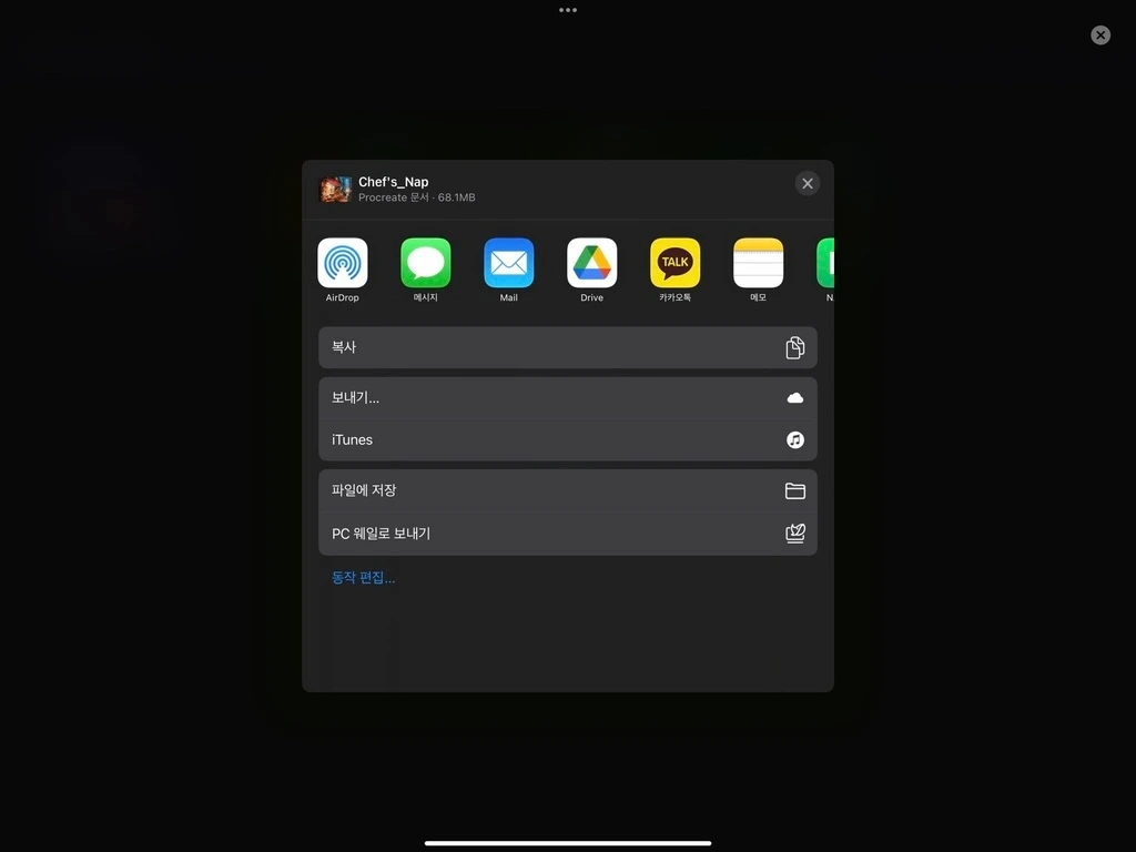 그린 그림을 카톡에 직접 공유하거나 아이패드 앨범에 바로 저장할 수도 있습니다. 작업물을 보호하기 위해서, 늘 다양한 경로에 파일을 백업해 두기를 권장합니다. 확장자 명 procreate로 캔버스를 내보내어 백업해 두면, 언제든지 어플로 다시 불러올 수 있습니다.