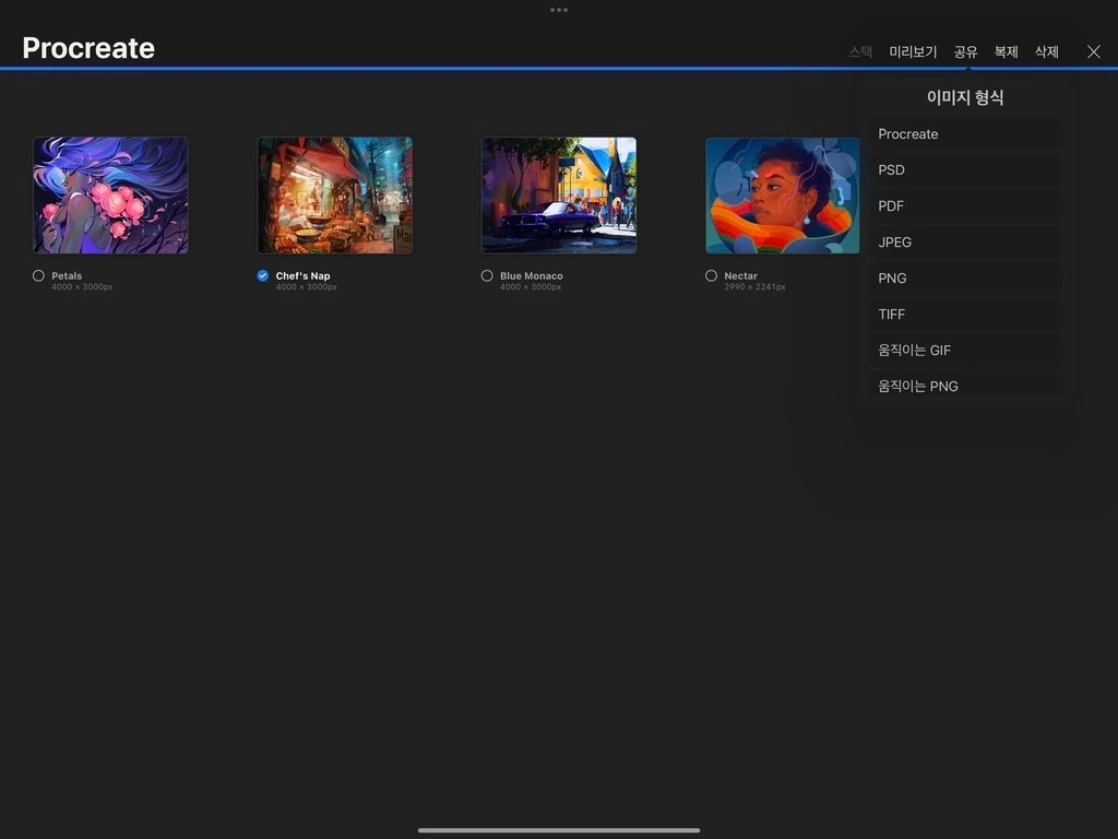 기본 확장자명인 Procreate와 PSD, PDF, JPEG, PNG 등의 확장자 명으로 공유가 가능합니다.