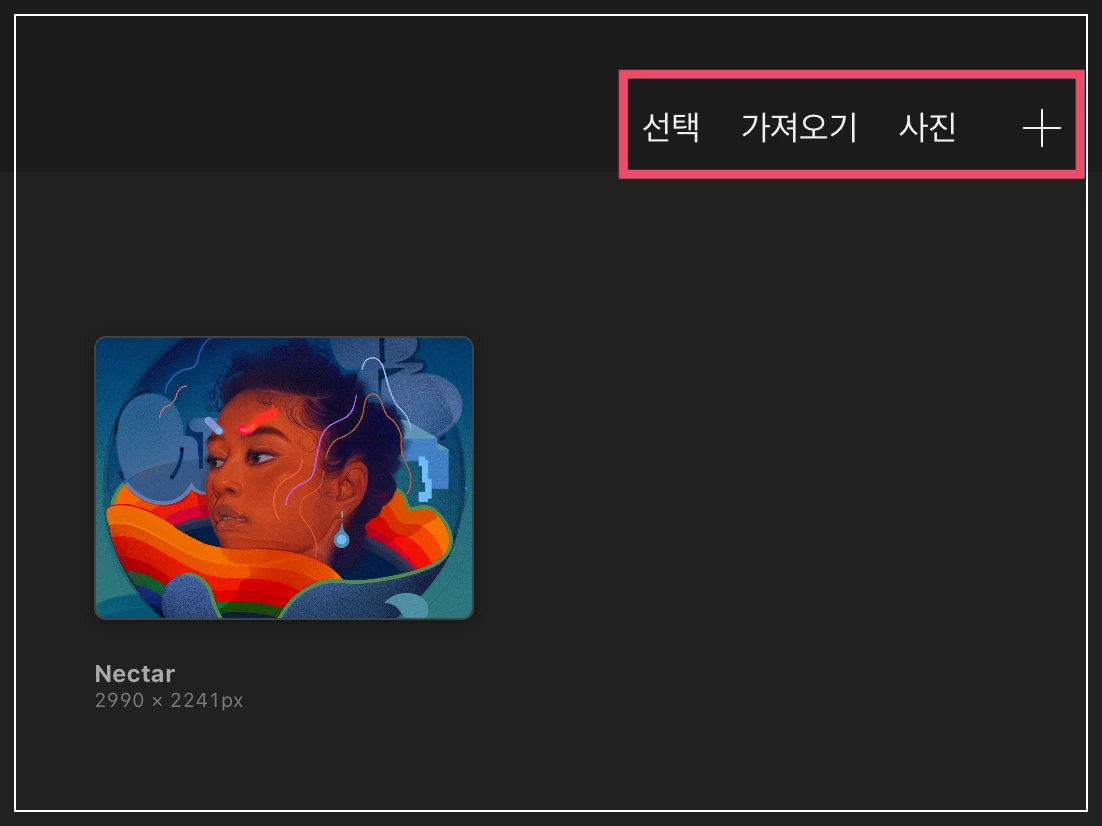 갤러리 우측 상단에는 선택, 가져오기, 사진, + 버튼이 보입니다. 이 메뉴들에 대해서 알아볼게요.