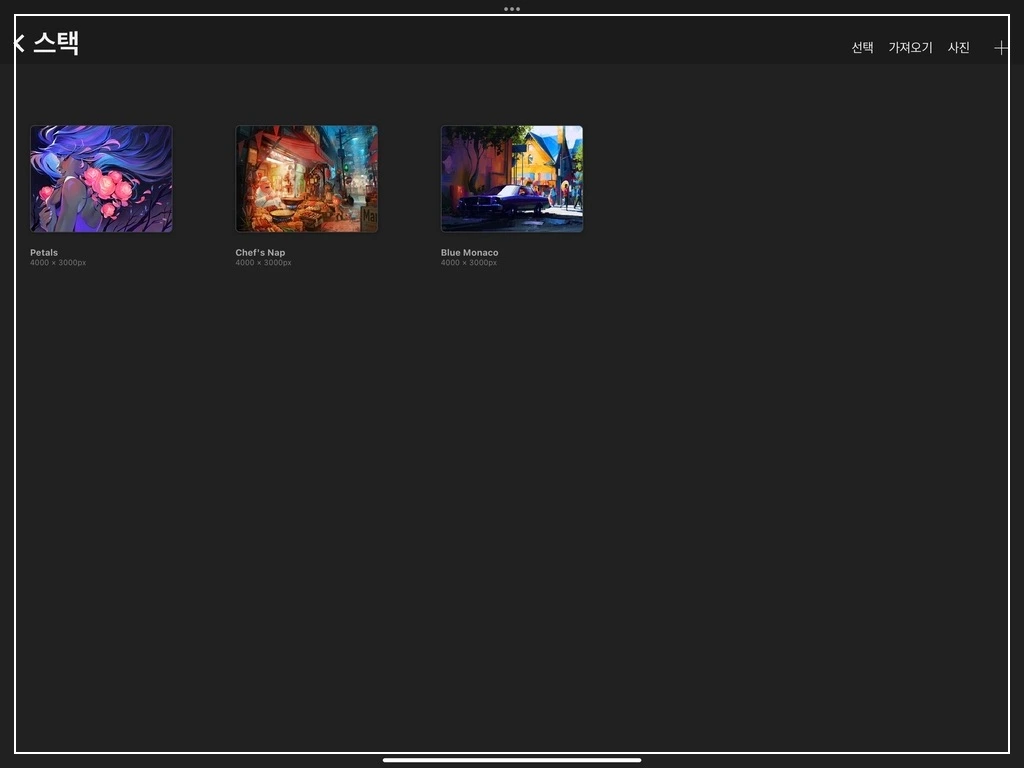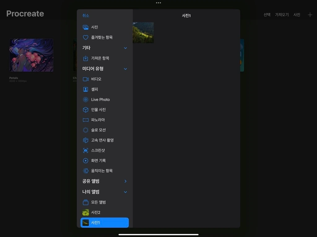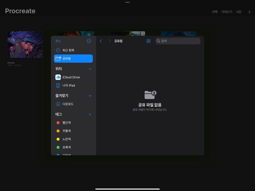 아이패드 기본 어플인 파일과 연동하여, 프로크리에이트에서 인식 가능한 파일을 가져옵니다. 이미지 포맷의 캔버스로 불러올 수 있는 파일 형식만 가져올 수 있으며, 가져올 수 없는 포캣의 파일은 흐리게 표시되며, 선택할 수 없습니다.