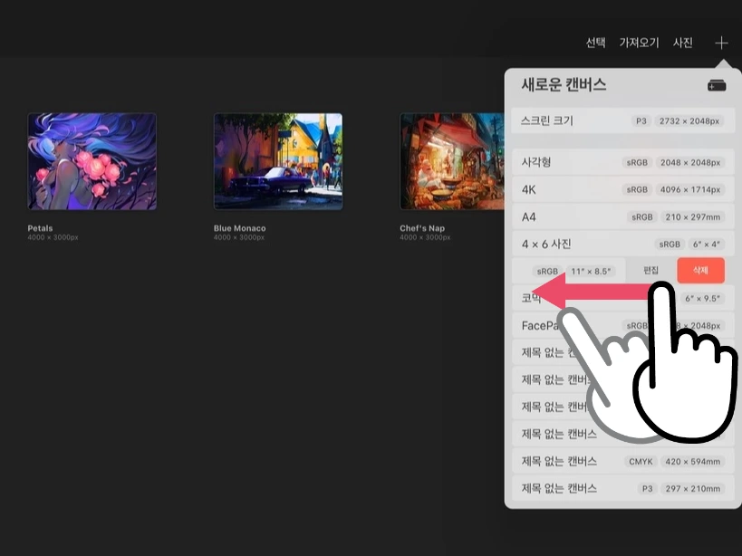 미리 준비된 새로운 캔버스 이름 위에서 손가락을 옆으로 플릭 하면, 숨겨진 편집, 삭제 메뉴가 나타납니다.