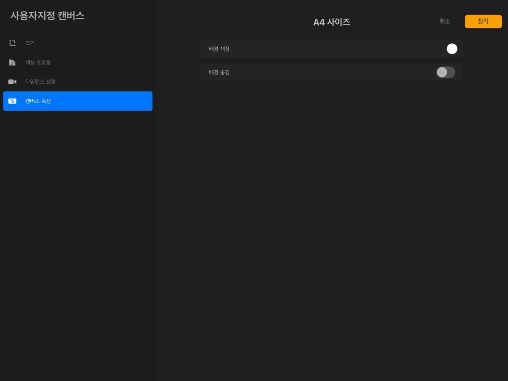 캔버스 속성 메뉴에 있는 배경 관련 설정은 캔버스 생성 후에도 언제든지 조정할 수 있기 때문에, 큰 고민 없이 두셔도 됩니다.