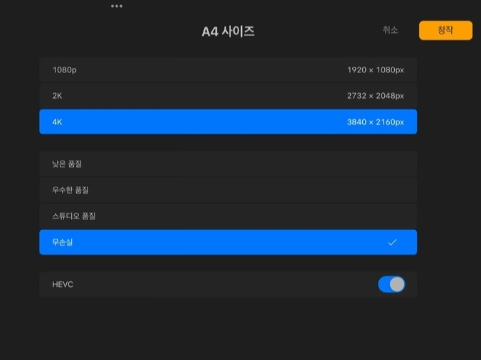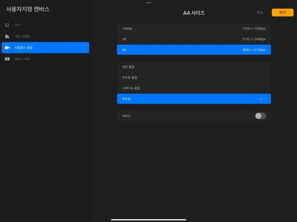 파일 확장자 명인 HEVC 옆 버튼을 탭 하여 활성화합니다. 동영상 녹화 여부는 캔버스 생성 후에도 조정 가능하지만, 해상도 및 품질은 조정할 수 없습니다.