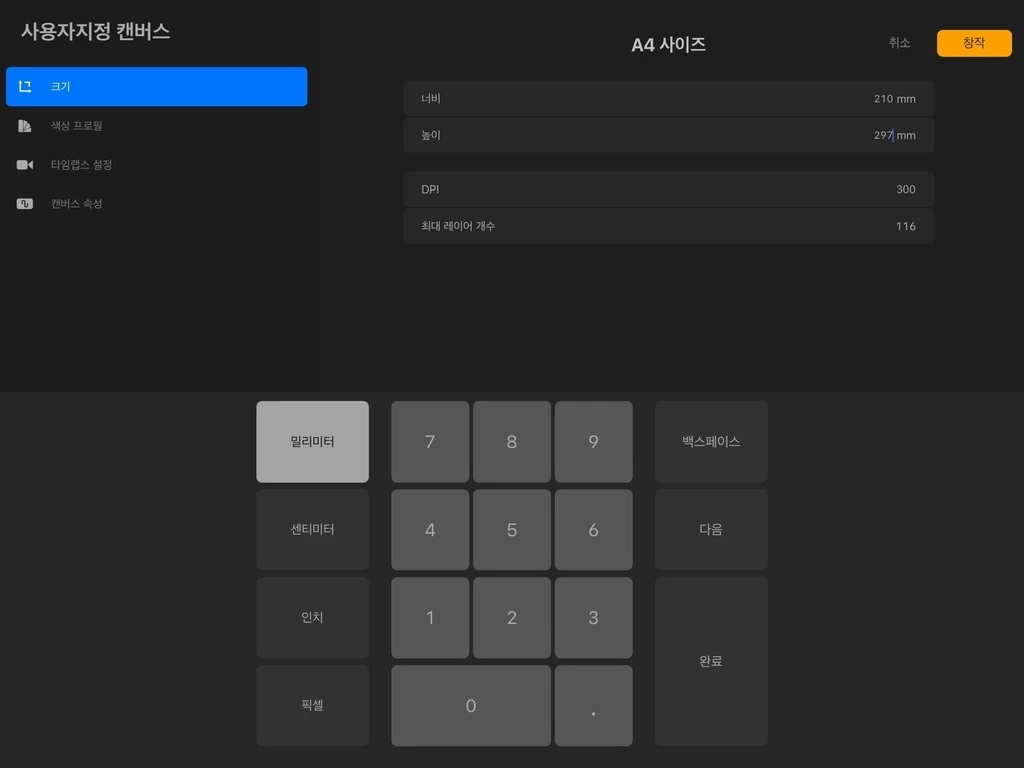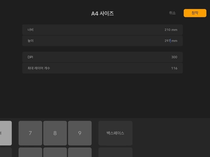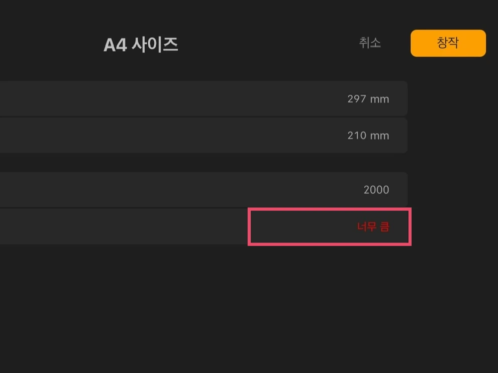 캔버스 크기나 DPI를 과도하게 크게 지정하면, 최대 레이어 개수 칸에 너무 큼이라는 문구가 빨갛게 등장합니다.