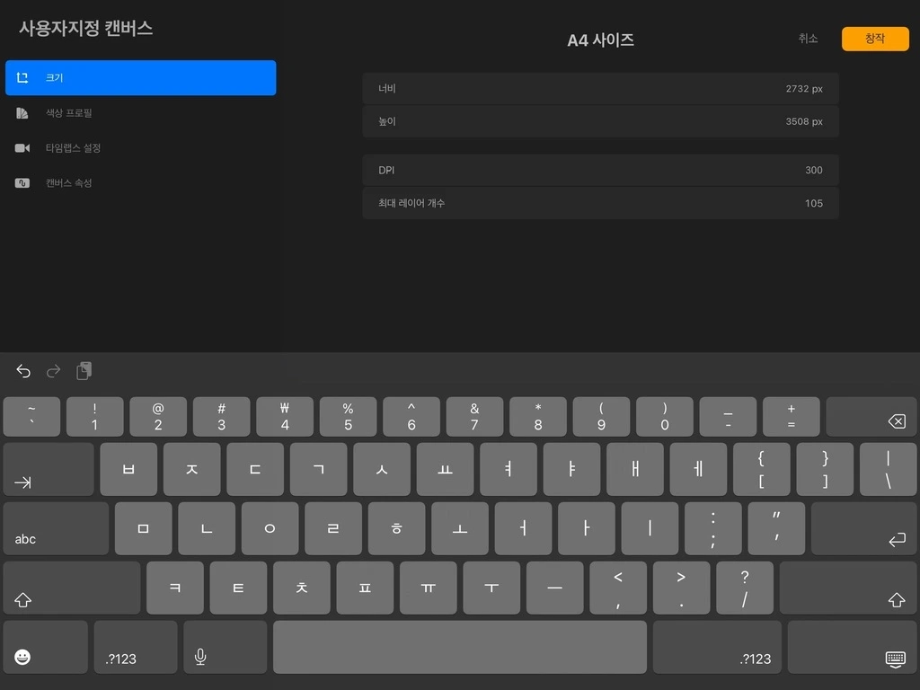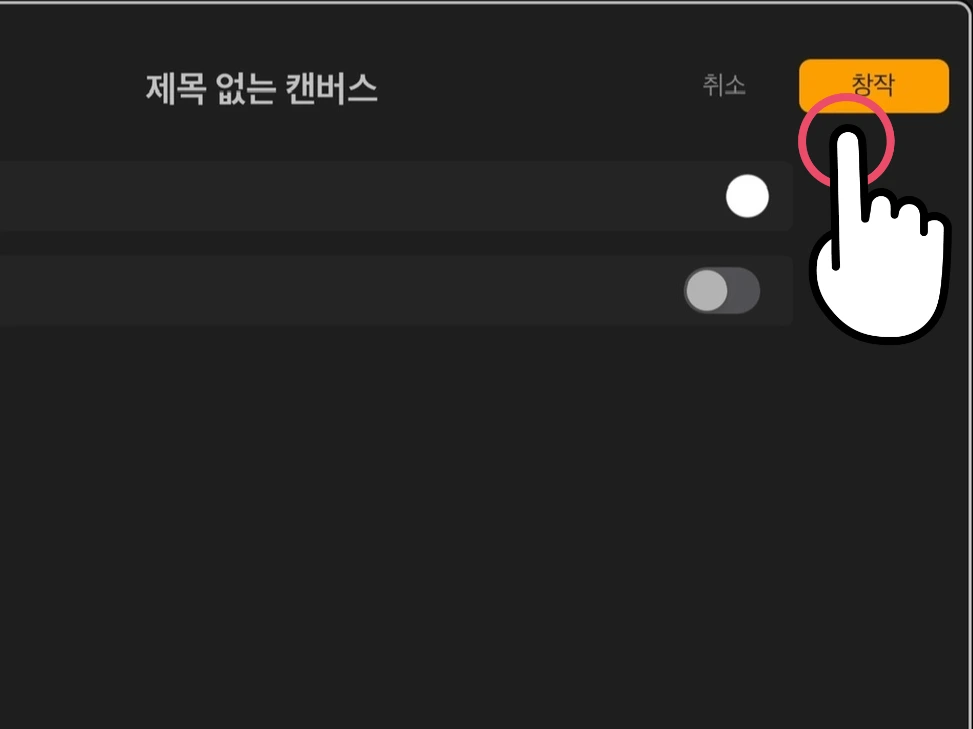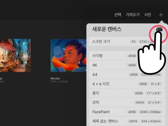 새로운 캔버스 우측에 놓인 버튼을 탭 하면, 사용자 지정 캔버스 창으로 이동합니다.