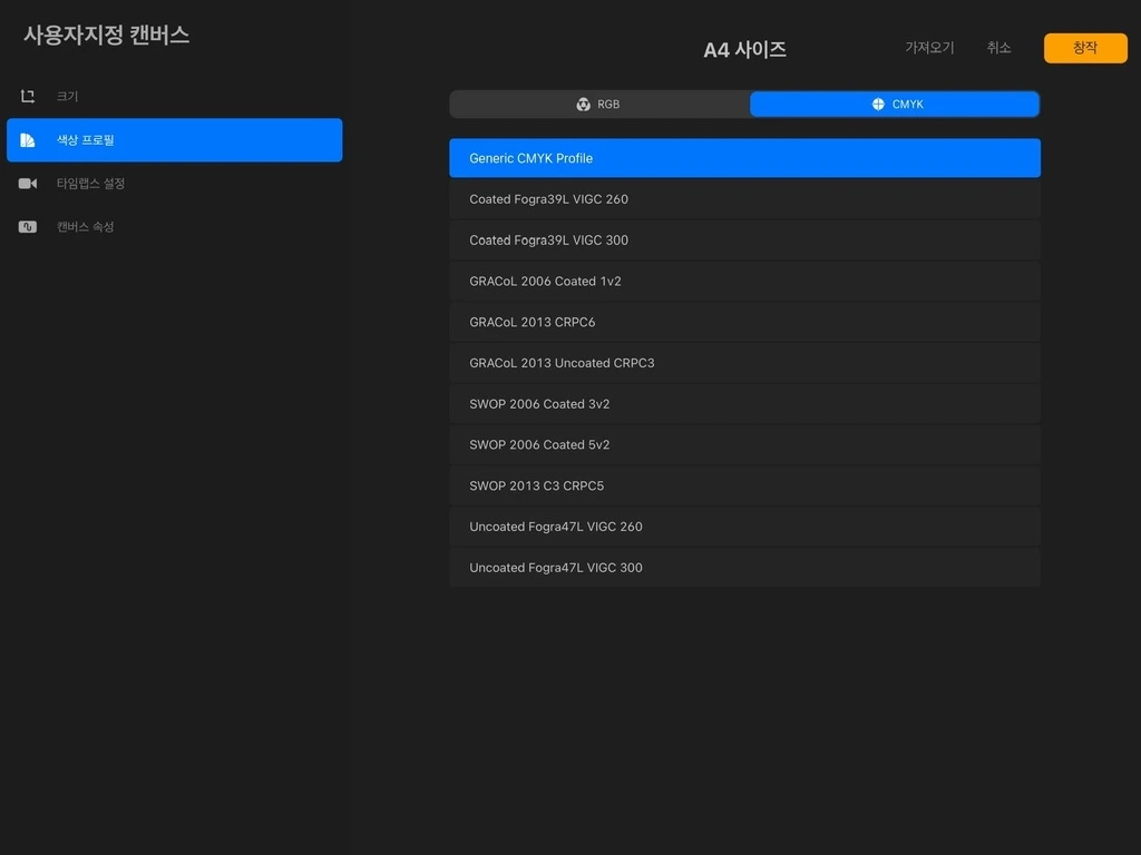 인쇄, 출판, 굿즈 제작 등 잉크를 사용해야 하는 출력용 이미지라면 CMYK 색상을 사용합니다. 다른 이유가 없다면, Generic CMYK Profile을 선택합니다.