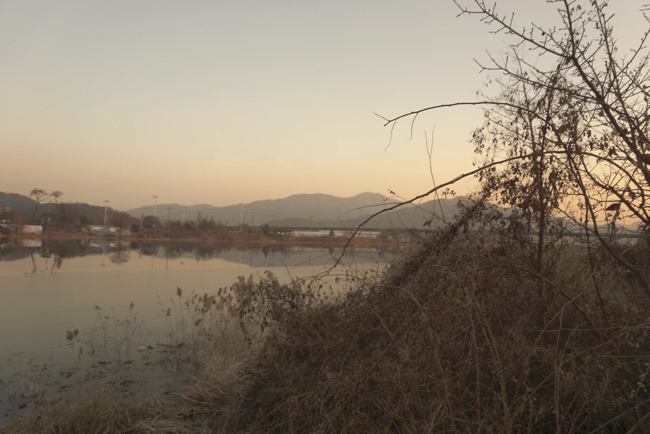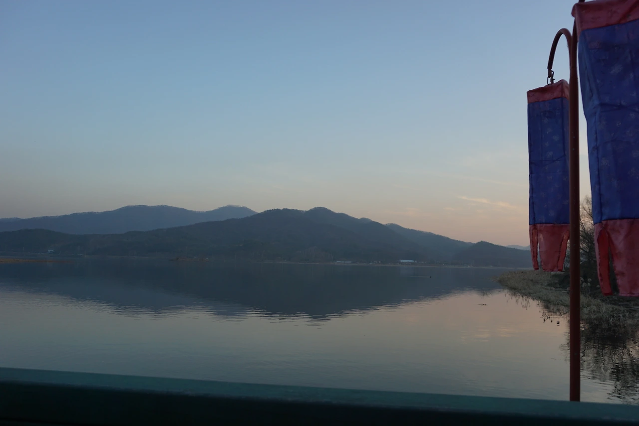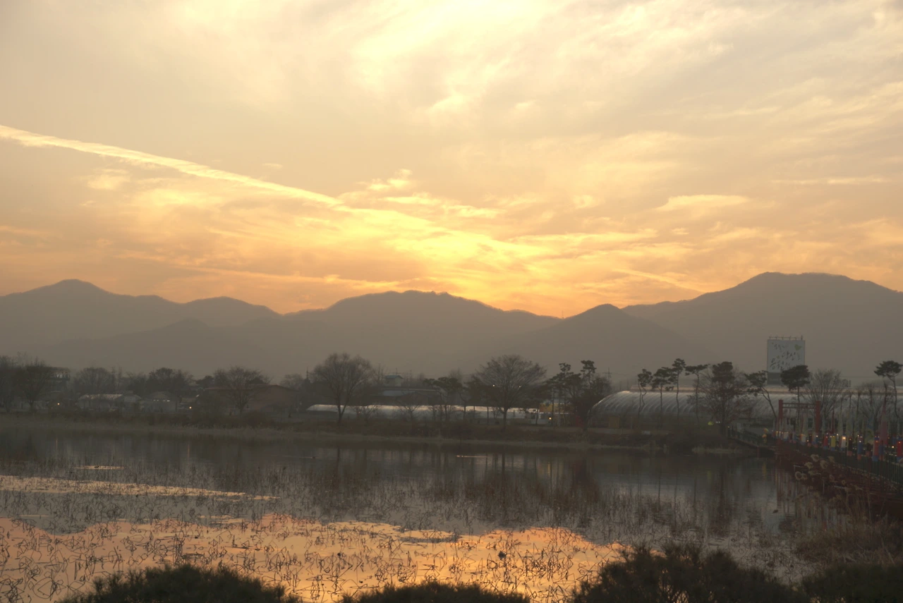 강과 산과 석양.