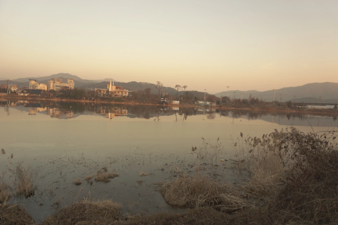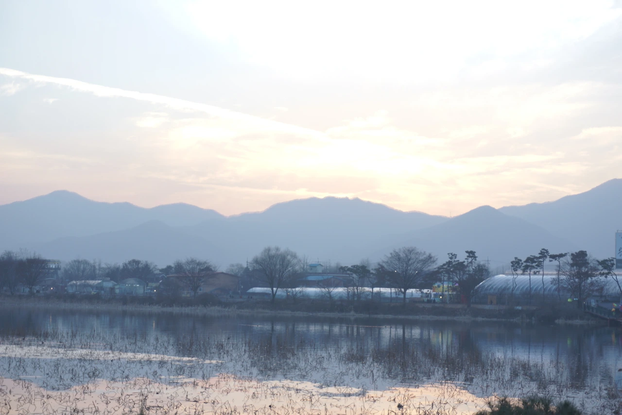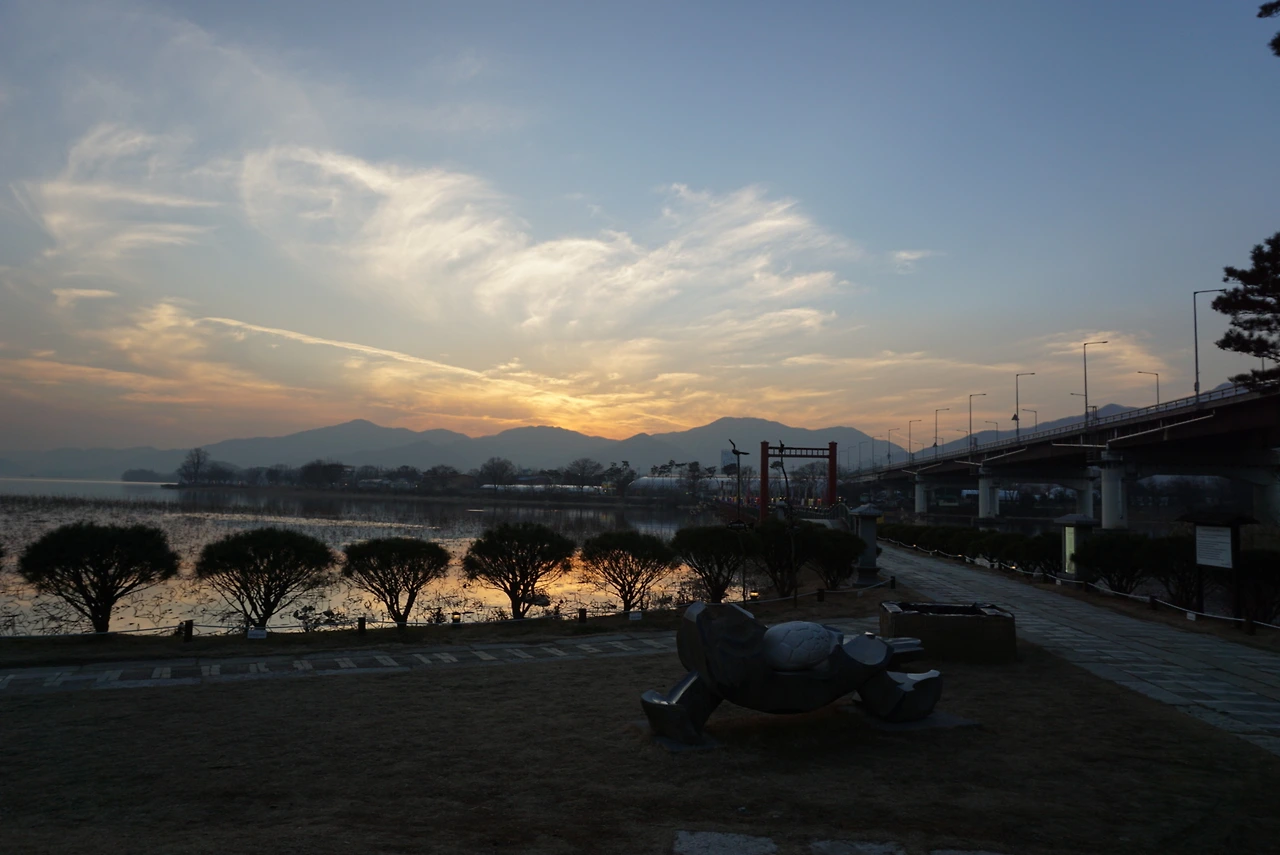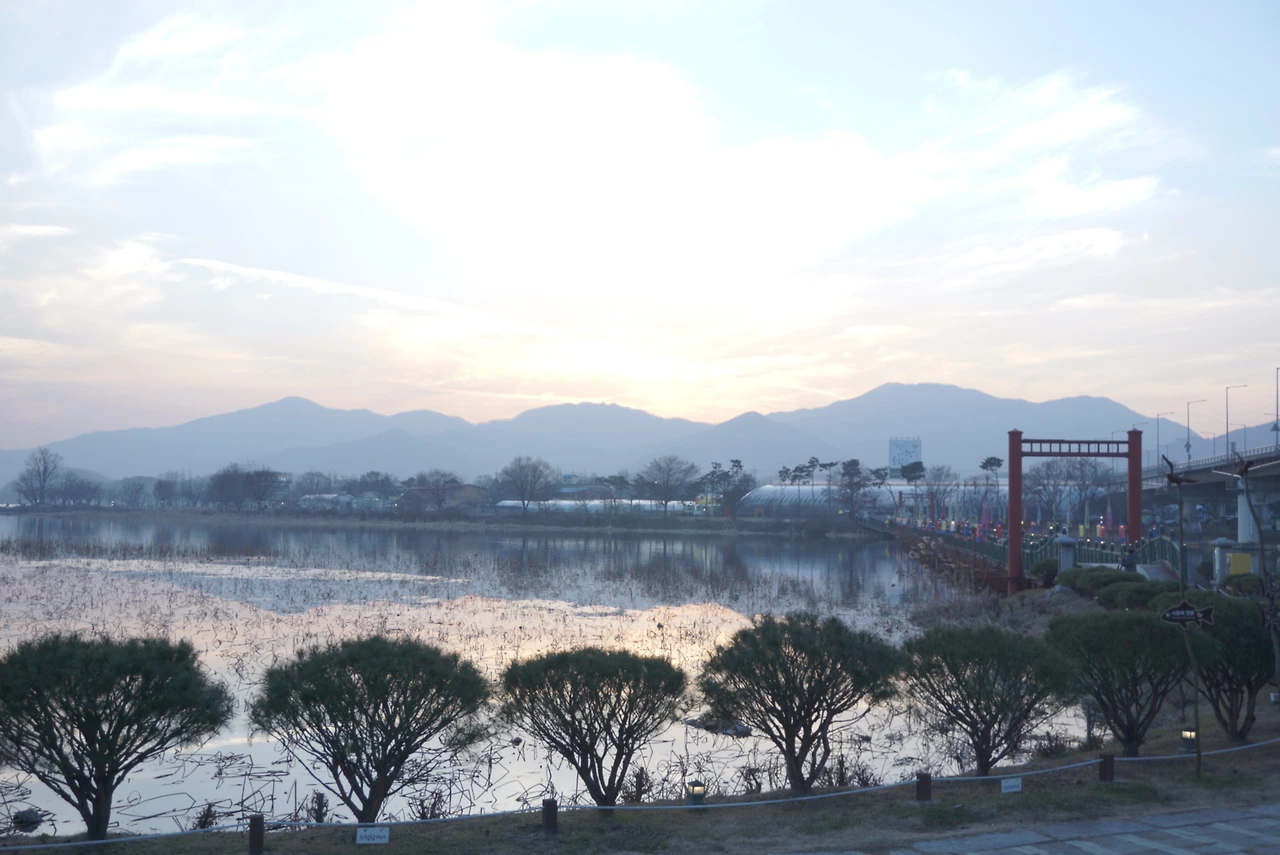 강과 산과 석양.
