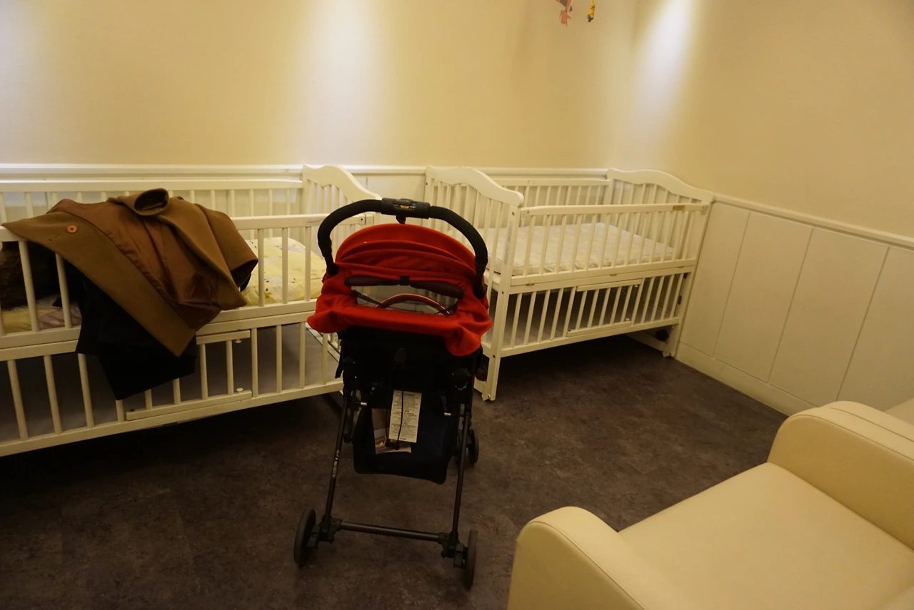 들어서면 한쪽으로 아기침대 2개와 쇼파 2개가 놓여져있다.