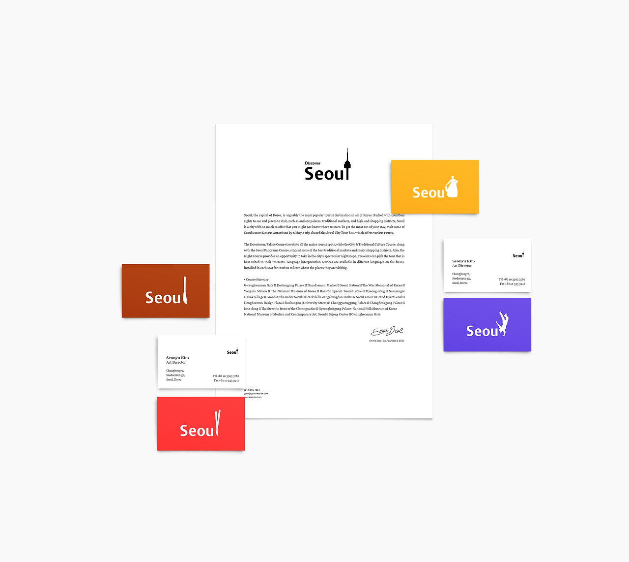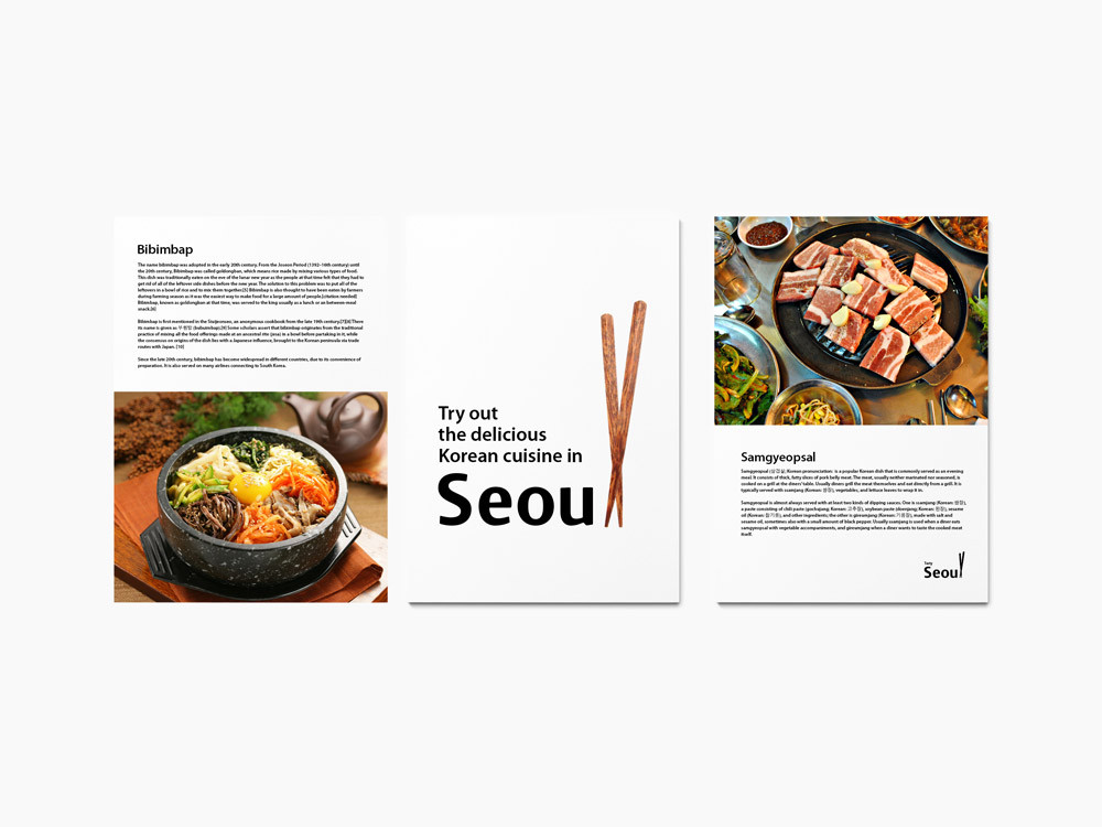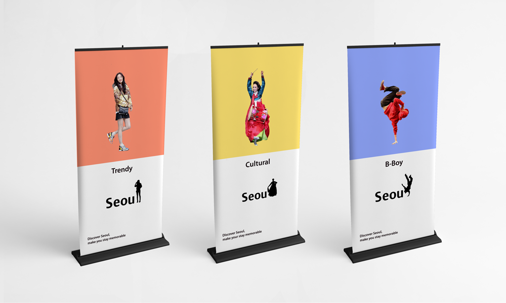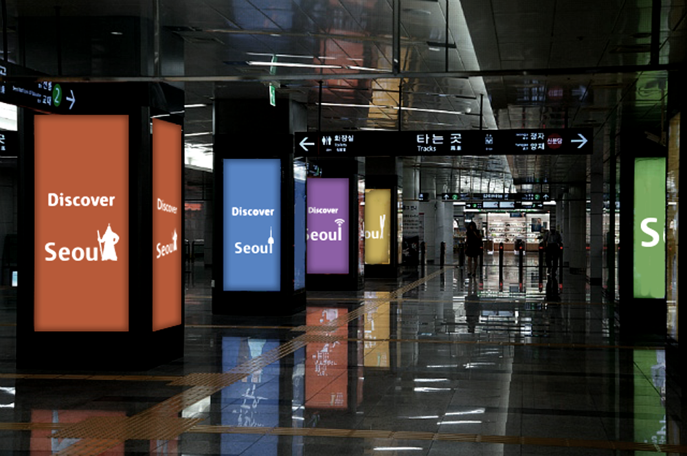 I think a lot of aspects that Seoul already has can be used to create a brand identity of Seoul. Seoul has a lot of things to eat, see and buy. I focused on this three parts by using the variation of 'L' in 'Seoul'. You can see many variations in 'L' that represents the 'Diversity' of Seoul. When tourists travel around Seoul, they can discover 'Different logos, in different places'. I want people to discover the variations of Seoul and find it enjoyable. SEOU cannot change but 'L' can in many ways, which is quite a different way to approach in building a brand identity. These days, flexible design is a huge trend so it will be very creative as well.