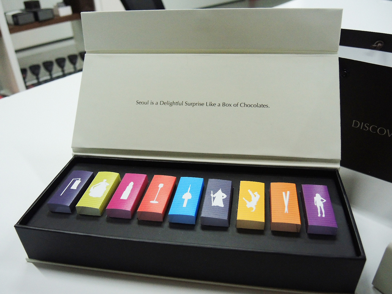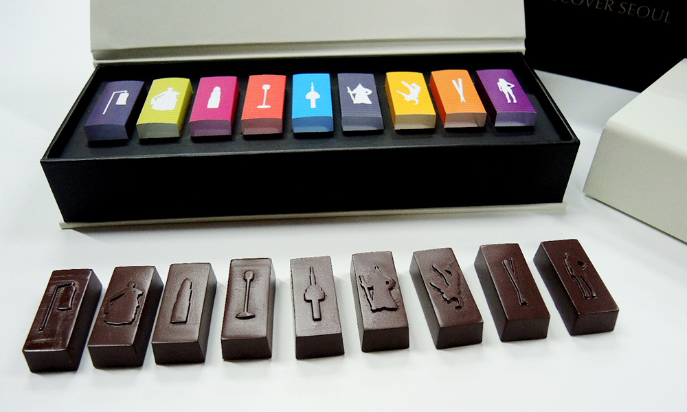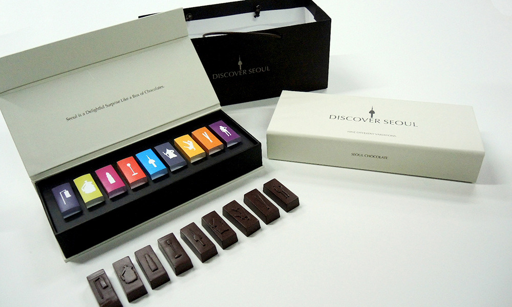Discover Seoul 컨셉에 맞는 관광상품으로 초콜렛을 선택했다. 그 이유는 초콜렛이라는 상품 자체가 되게 친근하고 거부감이 없는 음식이기에 정한거지만, 포인트는 그게 아니다. 중요한 건 서울의 다양한 모습을 한 상품에 다 담아갈 수 있는 것. 한과 세트든, 소주잔 세트든, 안경닦이 세트든, 열쇠고리 세트든 간에 내가 서울에서 경험한 추억이 그대로 새겨져 있는 상품이 있다면, 씩 웃으면서 하나정도 사가지 않을까. 디스커버 서울 초콜렛을 사면 내가 보았던 비보이 공연도 있고, 청계천 등불축제의 등도 있고, 남산타워도 있고, 한복 입은 사람도 있고, 샀던 립스틱도 있고.. 한번에 다 담아갈 수 있는 것이다.