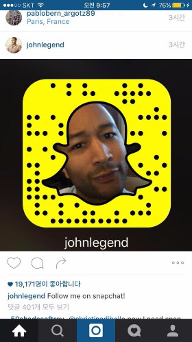 첫 번째 카메라 화면에서 스냅챗 아이콘을 탭하면 자신의 스냅코드가 나타난다. 스냅챗로고 안에 자신의 셀카자신을 올릴 수도 있다.