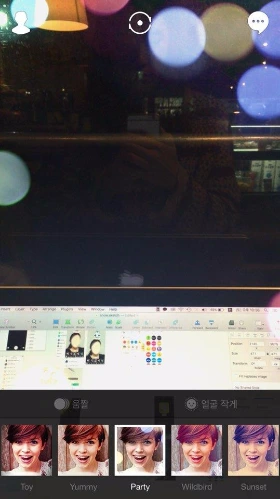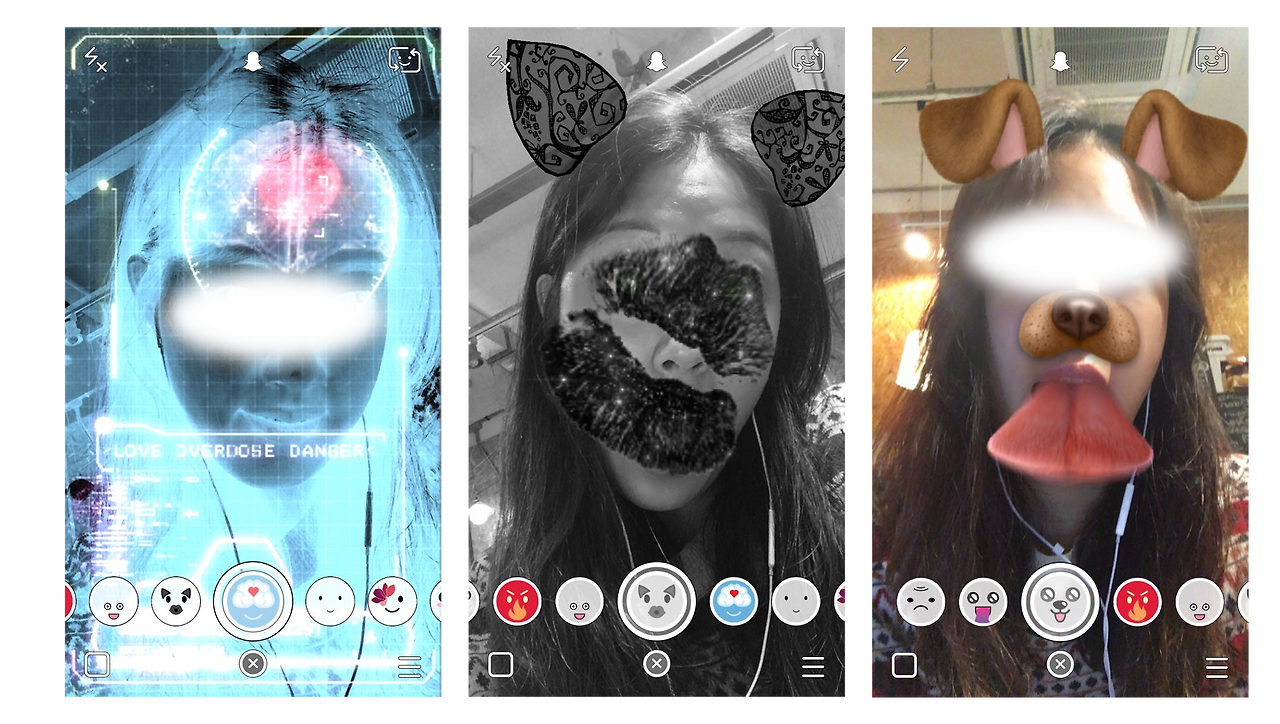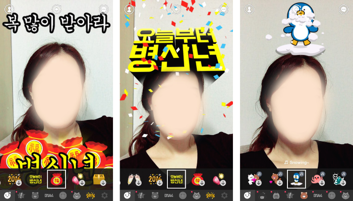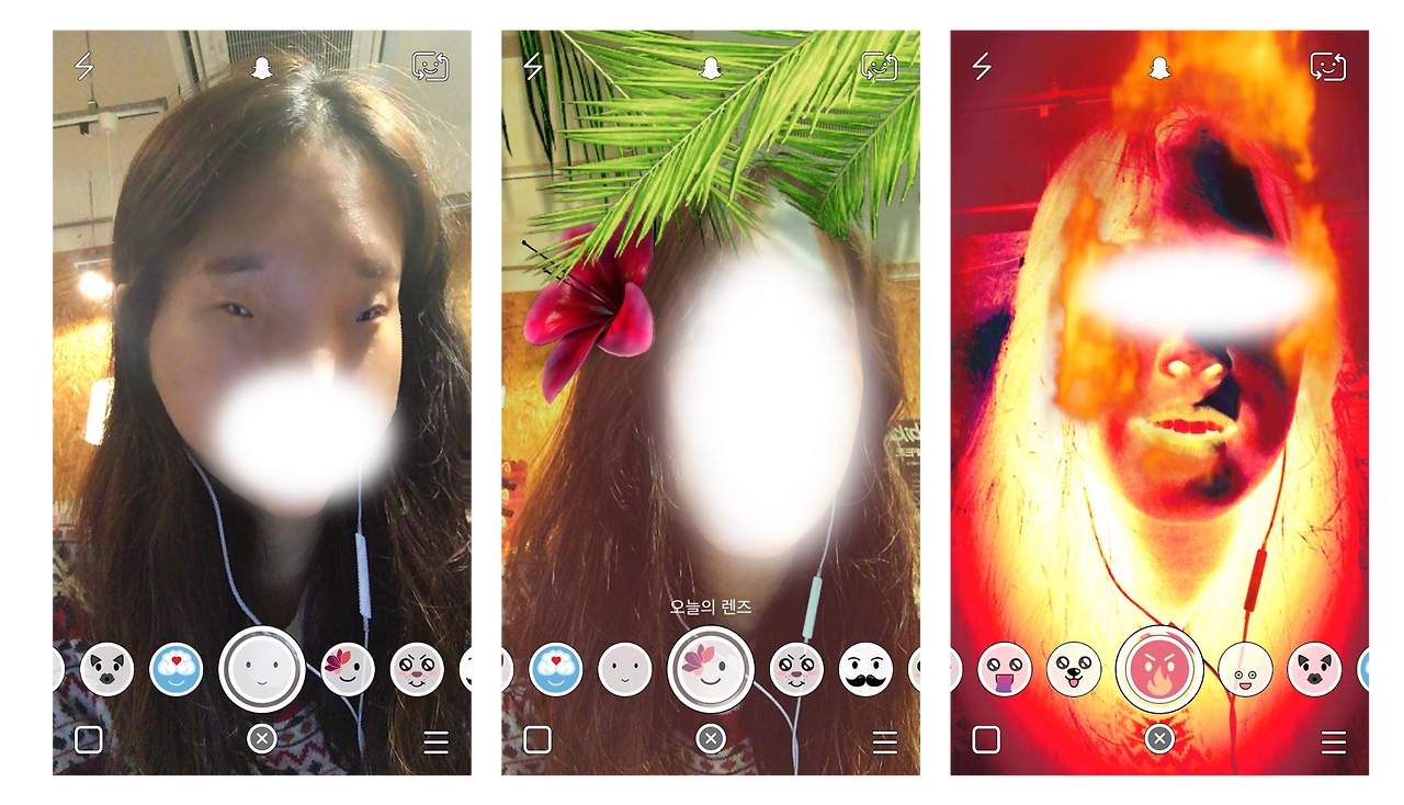 스노우의 셀카모드의 초기값은 자동으로 필터효과가 적용되어 있다. 자동으로 보정된 얼굴을 찍는 것이다. 스냅챗은 있는 그대로의 현재 상황을 공유한다면 스노우는 다양한 필터효과로 꾸민 내모습을 보여줄 수 있다.