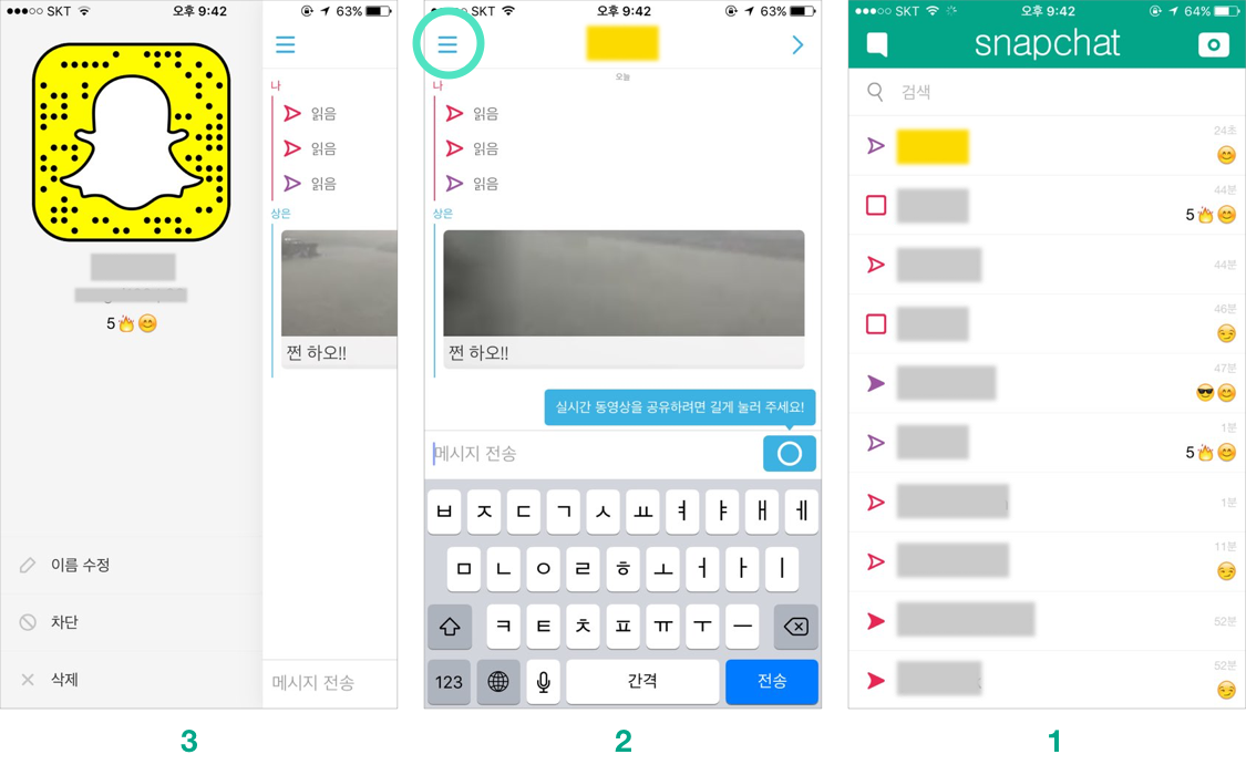 사진을 보내고 나면 1번 화면이 바로 나타난다. 친구들이 내가 보낸 사진을 읽었는지, 안 읽었는지 확인할 수 있다. 방금 사진을 보낸 친구를 한번 더 탭 하거나 or 왼쪽으로 스와이프(2번 화면)하면 해당 친구와의 대화창으로 이어진다. Menu Drawer를 탭하면 해당 친구의 프로필 페이지로 들어간다(3번 화면). 스냅챗을 처음 써보는 유저들은 왼쪽으로 스와이프하면 다른 페이지로 넘어가 혼란스러울 것이다. 3번, 스냅챗 로고에 여러 개의 dot을 볼 수 있는데 이것은 스냅코드이다.