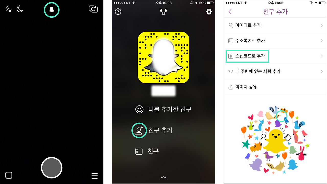3에서 친구추가 페이지로 이동할 때 위에서 아래로 스와이프 혹은 스냅챗 아이콘 탭.