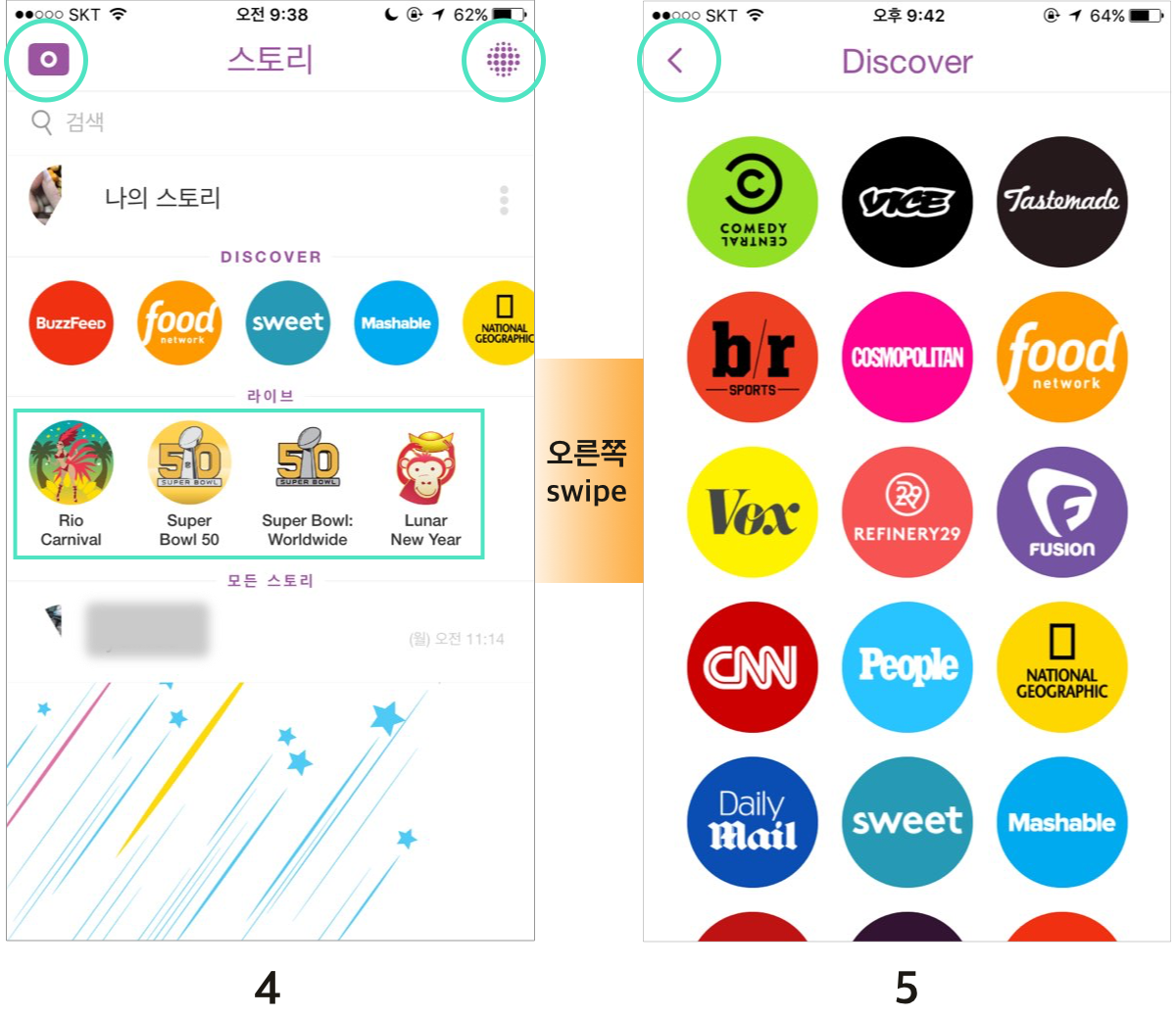 4번은 '스토리' 페이지이다.각 테마별로 전세계 실시간 영상들을 큐레이션해주는 서비스인 '라이브 스토리'가 있다. 얼마 전 세계적으로 큰 행사였던 Rio Carnival, Super Bowl 50, Super Bowl Worldwide, Lunar New Year 이 라이브에 올라왔었다. 몇 달 전, 도시 관련 라이브 스토리도 있었다. Seoul city에 동영상을 올렸는데 내 동영상이 올라갔었다. 전 세계 스냅챗 유저들이 모두 내 영상을 볼 수 있다니! 무지 신났었던 기억이... 또한 내 친구들의 사진이 24시간 동안 노출되는 모든 스토리가 있다.