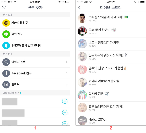 스냅챗과 친구추가하는 방식이 확연히 다른걸 알 수 있다. 스냅챗은 친구를 추가하려면 꽤 능동적인 노력을 요구하는 반면 스노우는 페이스북 연동이 가능하기 때문에 친구추가가 매우 쉽다. 그래서 오히려 사적인 메신저의 매력이 떨어지는 것 같기도 하다. 연동이 자동으로 되기 때문에 보고 싶지 않은 친구들도 자동추가되니... 그러나 초기에 유저들을 많이 유입시키기 위해서 택한 방법이지 않을까 싶다.