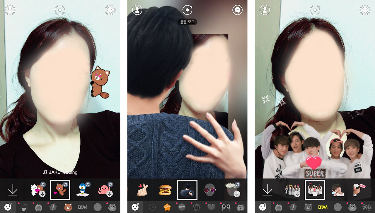 10대~20대 여성들을 타깃으로 한 귀엽고 아기자기한 스티커도 많고 아이돌 스티커도 있지만, 오히려 스티커가 너무 많아 메신저의 기능보다는 카메라앱의 기능이 부각되는 것 같다. 스냅챗처럼 자동폭파 메신저로 성공시킨다는 목표보단 초기에는 사진결과물이 기존 sns에 최대한 바이럴되는 것에 초점을 둔 것 같다.