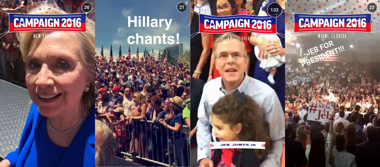 존레전드와 같은 유명인이 스냅챗을 통해 팬들과 소통하는 것은 물론이고, 미국 대선주자들도 스냅챗의 라이브기능을 활용함으로써 유세현장이나 토론회의 실시간 현황을 공유한다. 차기대선의 열쇠를 쥐고 있는 미국 밀레니얼 세대의 71%가 사용하는 스냅챗은 차기 대선후보들에게 그들과 소통하는 한 방법이 된 것이다. 미국에선 실로 엄청난 영향력을 가지고 있는 플랫폼임을 알 수 있다.