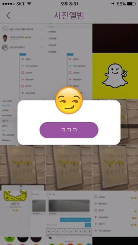 스냅코드를 누르면 사진앨범으로 들어가는데 스냅코드가 있는 사진을 눌러 친구를 추가하는 식이다. 내 스냅코드 사진을 눌렀더니 위와 같은 팝업이 떴다. 자기 자신을 친구추가를 하다니! 하고 씩 웃는 표정인가... 귀엽다. 역시 신선하다. 스냅챗은 이런 자잘한 부분에서도 재밌는 사용자 경험을 주는 것 같다.
