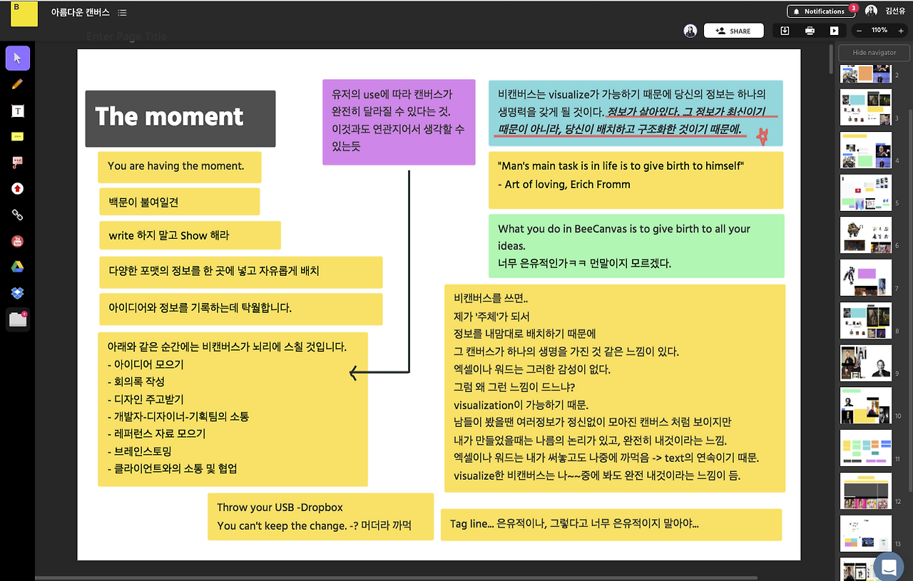 비캔버스로 여러 매체에서 가져온 정보와 아이디어들을 자유롭게 배치해놓으면, 그러한 아이디어가 생각지도 못한 순간에 '연결'되고 '관계'가 만들어져 번쩍이는 아이디어로 꽃피게 되는 경험을 할 수 있다.