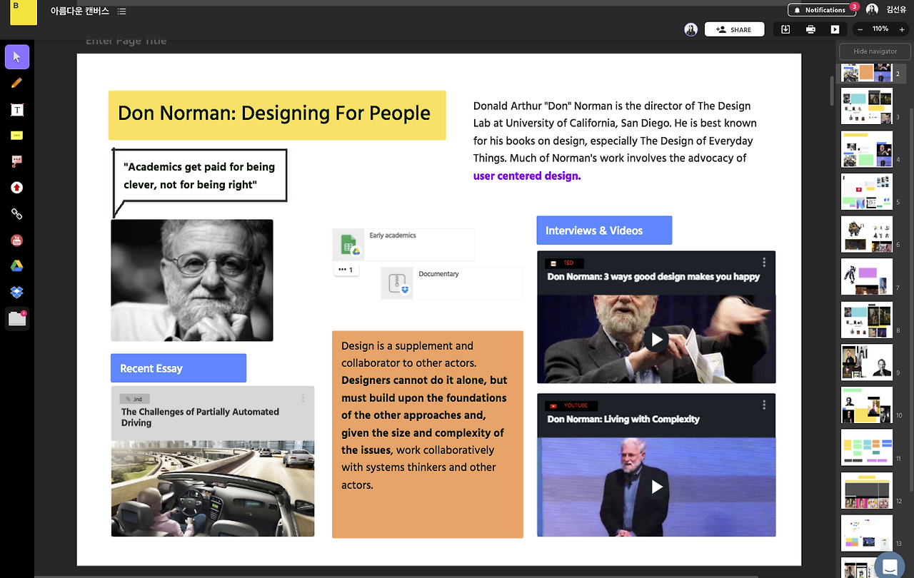 디자인의 거장으로 불리는 도널드 노먼에 대해 조사한 캔버스. 도널드 노먼에 대한 자료를 웹 링크, 유튜브 영상, 드롭박스, 구글드라이브등 다양한 곳에서 모아 기록하였다.