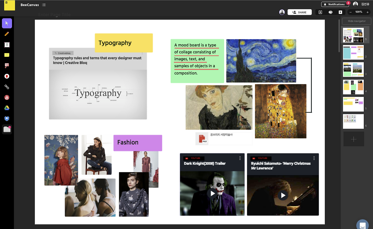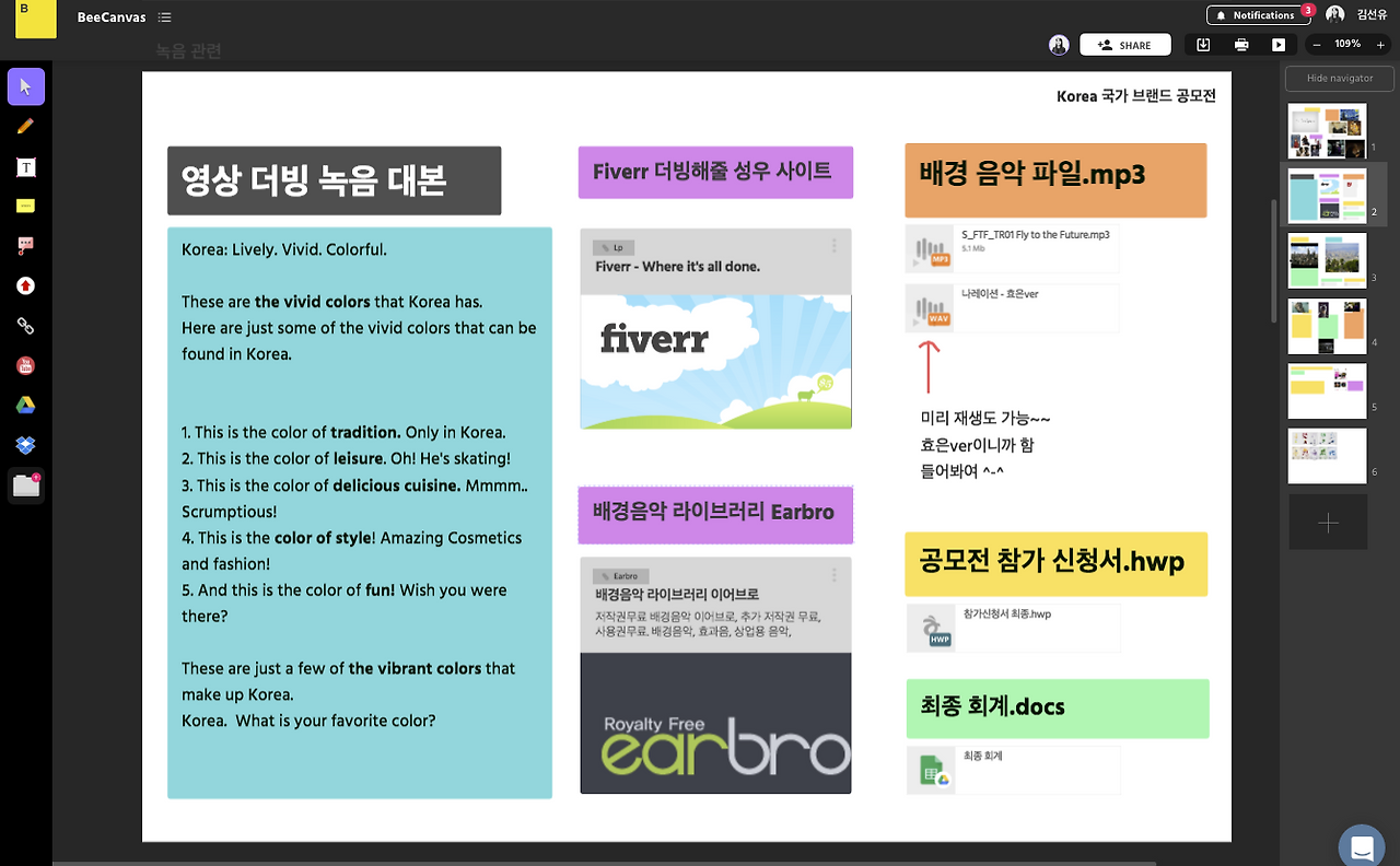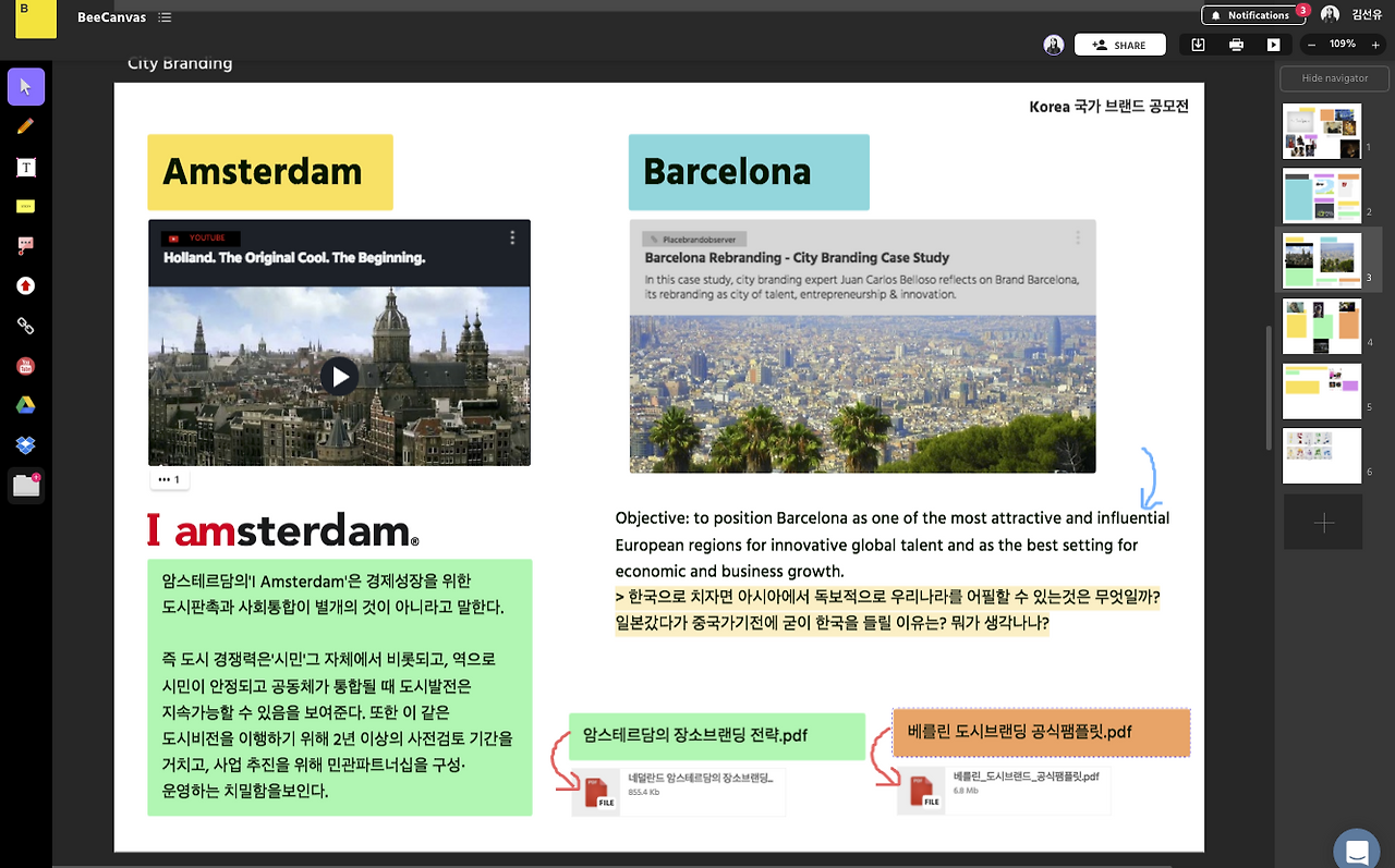 국가 브랜드에 대한 PDF파일, 웹 링크, 유튜브 영상을 캔버스에 모아 한눈에 보기 쉽게 정리할 수 있었음은 물론, 내가 올린 자료에 대해 팀원이 실시간으로 코멘트도 달 수 있었다.