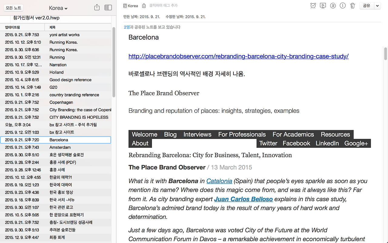 한번은 대학생때 국가브랜드 영상 공모전을 준비하면서 두 명의 팀원들과 에버노트로 협업을 한 적이 있었다. 세 명이 동시에 세계 각국의 브랜딩에 대해 각자가 조사한 자료와 의견을 한데 모아 공유하는데 사용했다. 우리가 모았던 자료들은 보통 기사와 같은 웹 링크, 유튜브 동영상, 작업물에 들어갈 동영상, 음악 파일, PDF 논문자료, 각자 준비해온 아이디어 텍스트, 레퍼런스 이미지 등이 주를 이루었다.