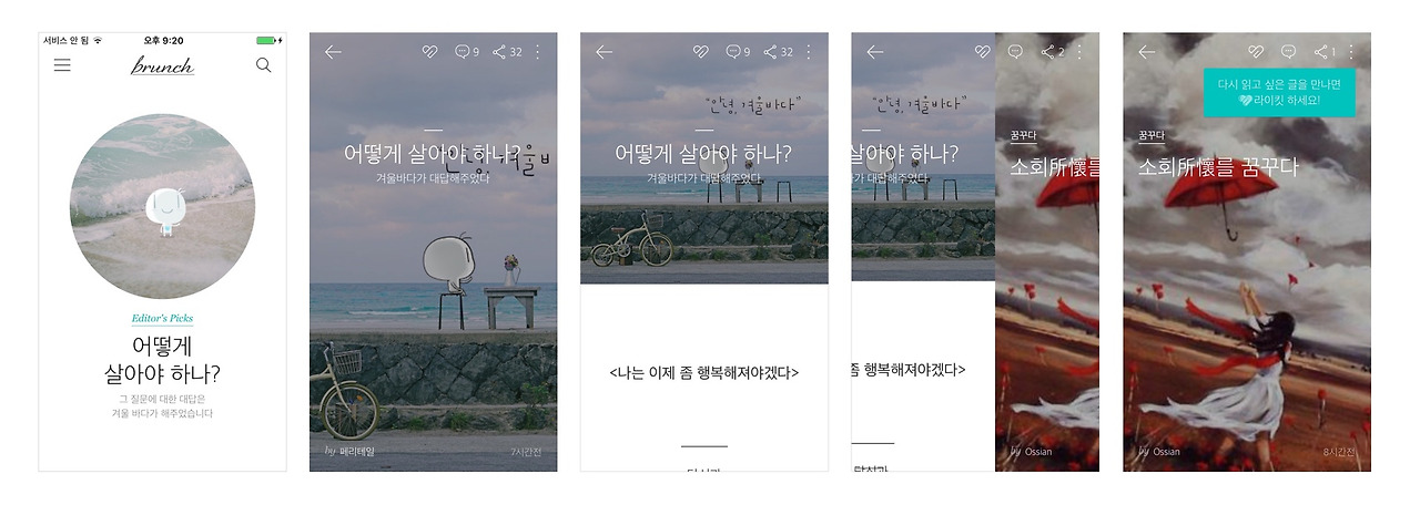 위아래로 스와이프를 하다가 맘에 드는 글을 발견한 후 그 글을 읽고 싶으면 한번 더 탭을 해야 한다. Depth가 하나 더 추가되는 것이다. 브런치 홈에 나타나는 화면은 일종의 글의 cover일 뿐 그 글을 바로 볼 수 있는 것은 아니다. 나는 처음에 이 브런치를 실행시켰을 때 맘에 드는 글의 제목을 발견하면 아래로 스와이프를 하면 바로 그 글을 읽을 수 있을 거라 기대했다.