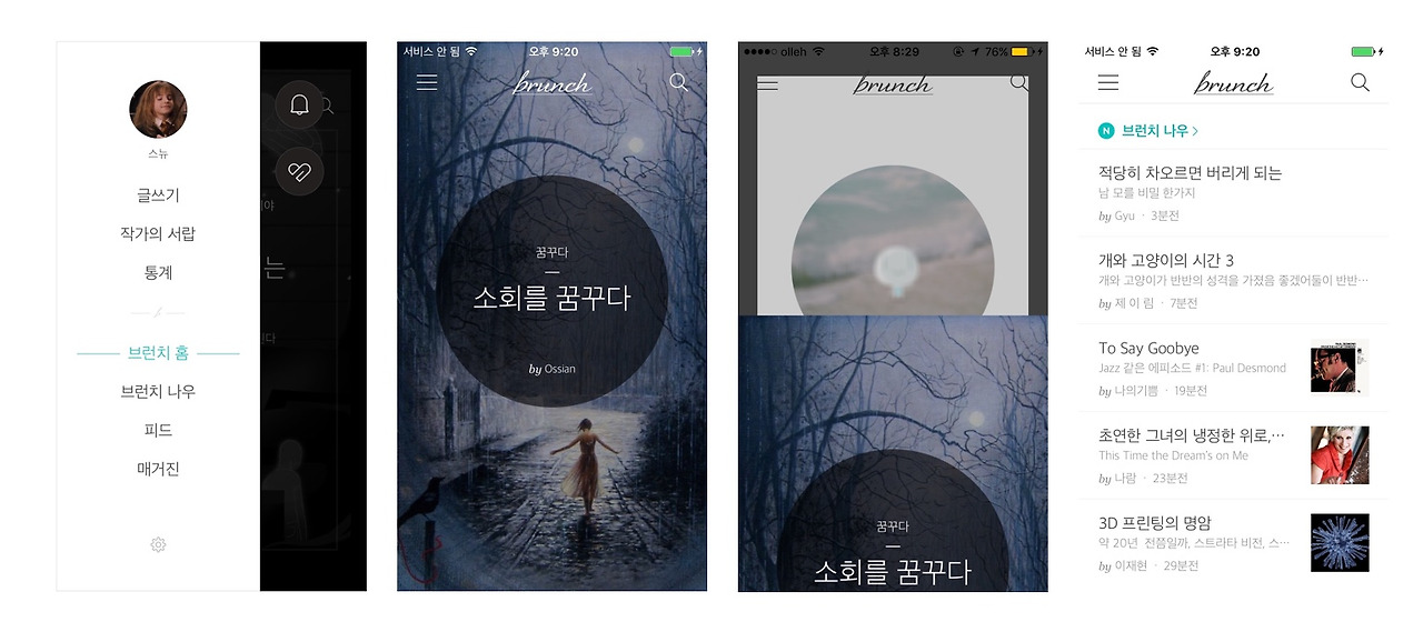 앱을 처음에 실행시켰을 때 기본 화면은 브런치 홈이다. 브런치 앱 특성상 컨텐츠 중심이기 때문에 UX 디자이너는 햄버거 메뉴(사이드바)를 쓴 것 같다. 애플은 햄버거 메뉴를 싫어한다는데 그 이유는 내가 지금 어디있고 어디로 갈 수 있는지를 나타내지 못하기 때문이다. 기본 화면인 브런치 홈에서는 위아래로 스와이프하면 랜덤으로 추천글로 이동하게 된다.