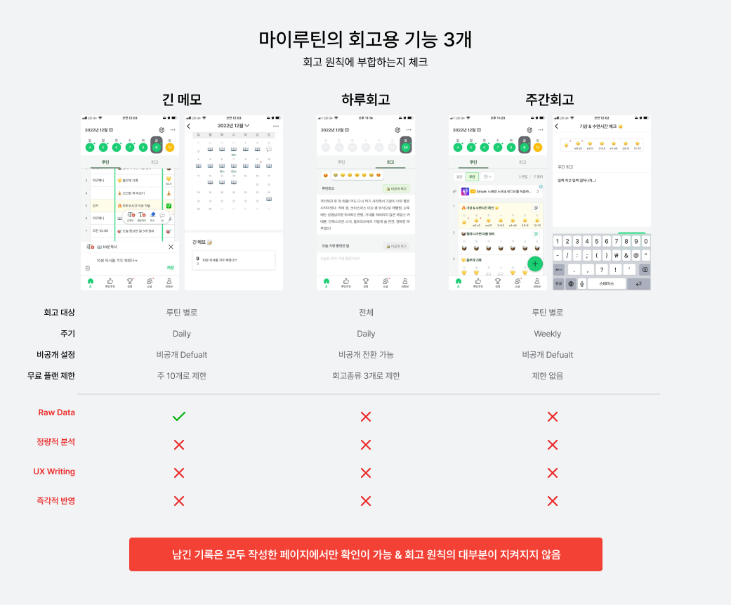 마이루틴 역시 짧은 메모, 긴 메모, 루틴회고 등 회고와 관련한 기능들을 갖추고 있었으나, 사용해 보니 아쉬운 부분들을 발견했다. 이 기능들만 잘 갖춰지면 더 많은 사람들이 꾸준히 사용할 것이라고 생각했기 때문에, 애정을 담아 마이루틴을 리디자인해 보았다.