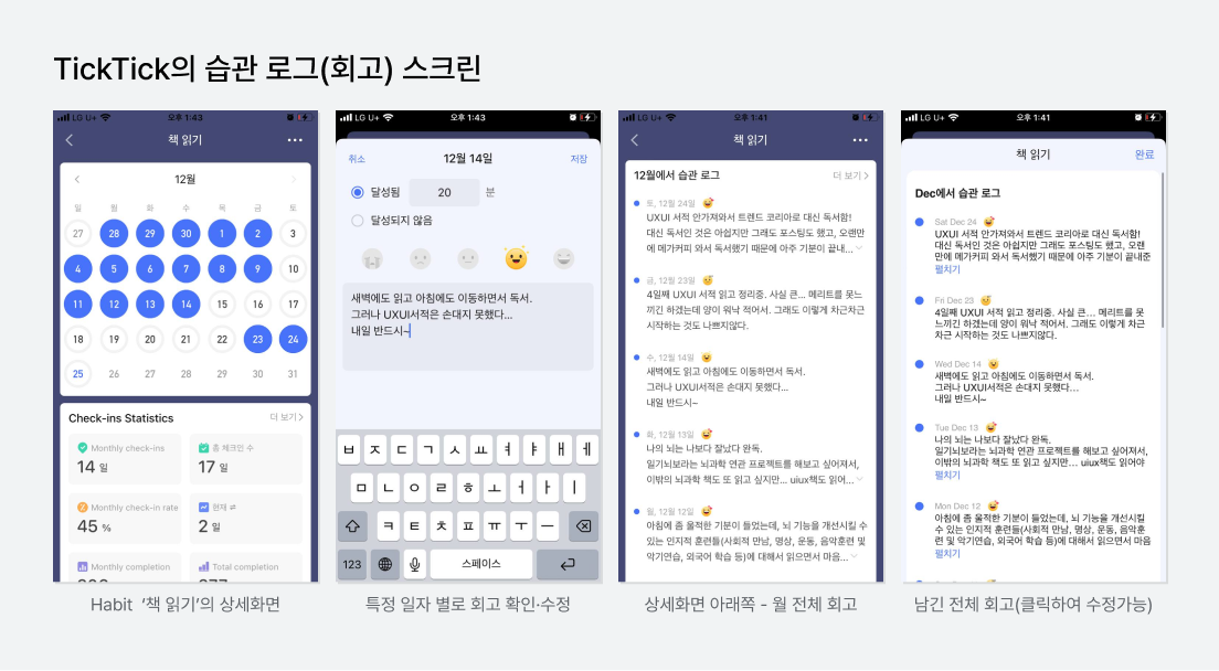 Habit에서는 매일 진행완료를 누를 때마다 만족도와 함께 '습관 로그'를 입력한다. Habit 달성에 대한 개인적인 리뷰를 적는 것이다. 각 Habit 별 상세 페이지에서 작성했던 습관 로그들을 쭉 볼 수 있다.