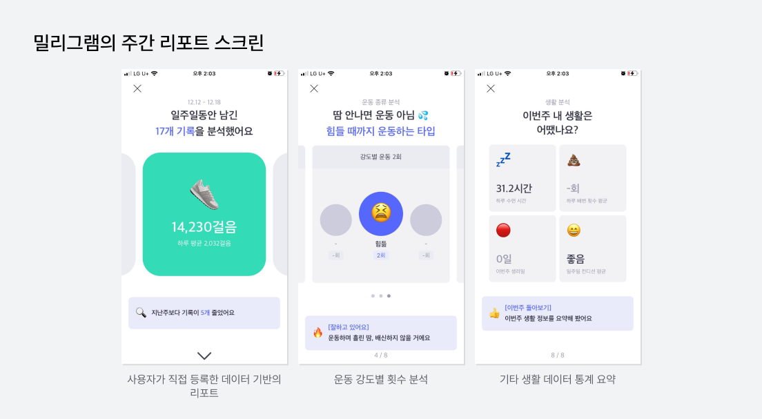 밀리그램은 운동 및 신체기록 등을 관리하는 어플이다. 다루는 데이터가 다양해, 모든 데이터들을 그대로 보여주는 대신, 데이터 별 가장 적합한 형태로 분석을 제공한다. 항목별로 적절한 UX Writing을 통해 사용자를 격려하고 있다. 다만, 사용자별로 다른 목표치에 따라 분석 내용도 개인화되어야 하는데 그렇지 않아 아쉬웠다. 열심히 운동한 기록을 공유하기 좋도록 리포트 형식을 선택한 것으로 추측된다.