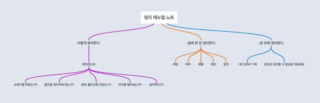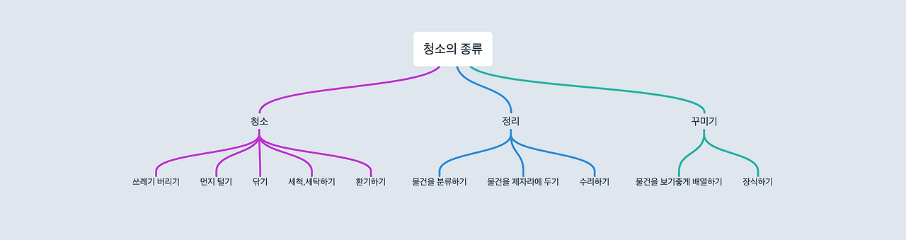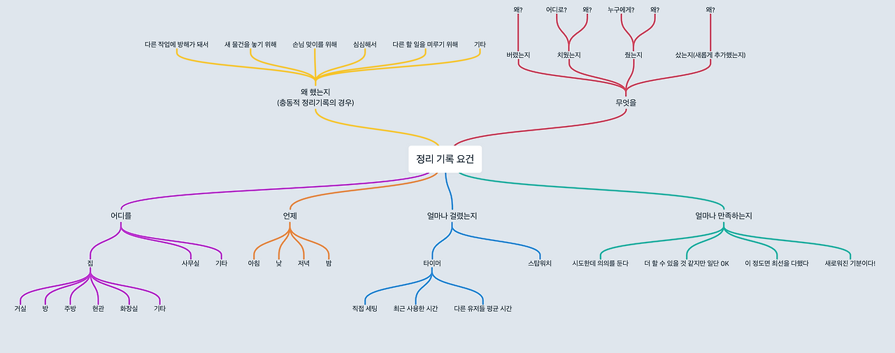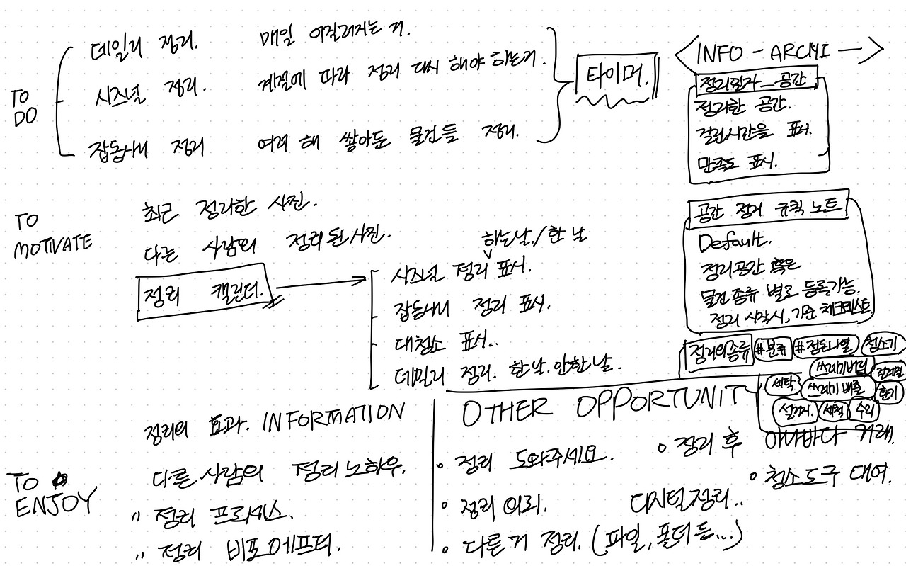 앱 화면 설계에 쓰이는 정보 구조도랑은 조금 다르게 청소 및 정리정돈 자체에 대한 개념적인 분류이다. 화면 설계용 구조도는 다음 편에서 작성하고 적용하려고 한다.