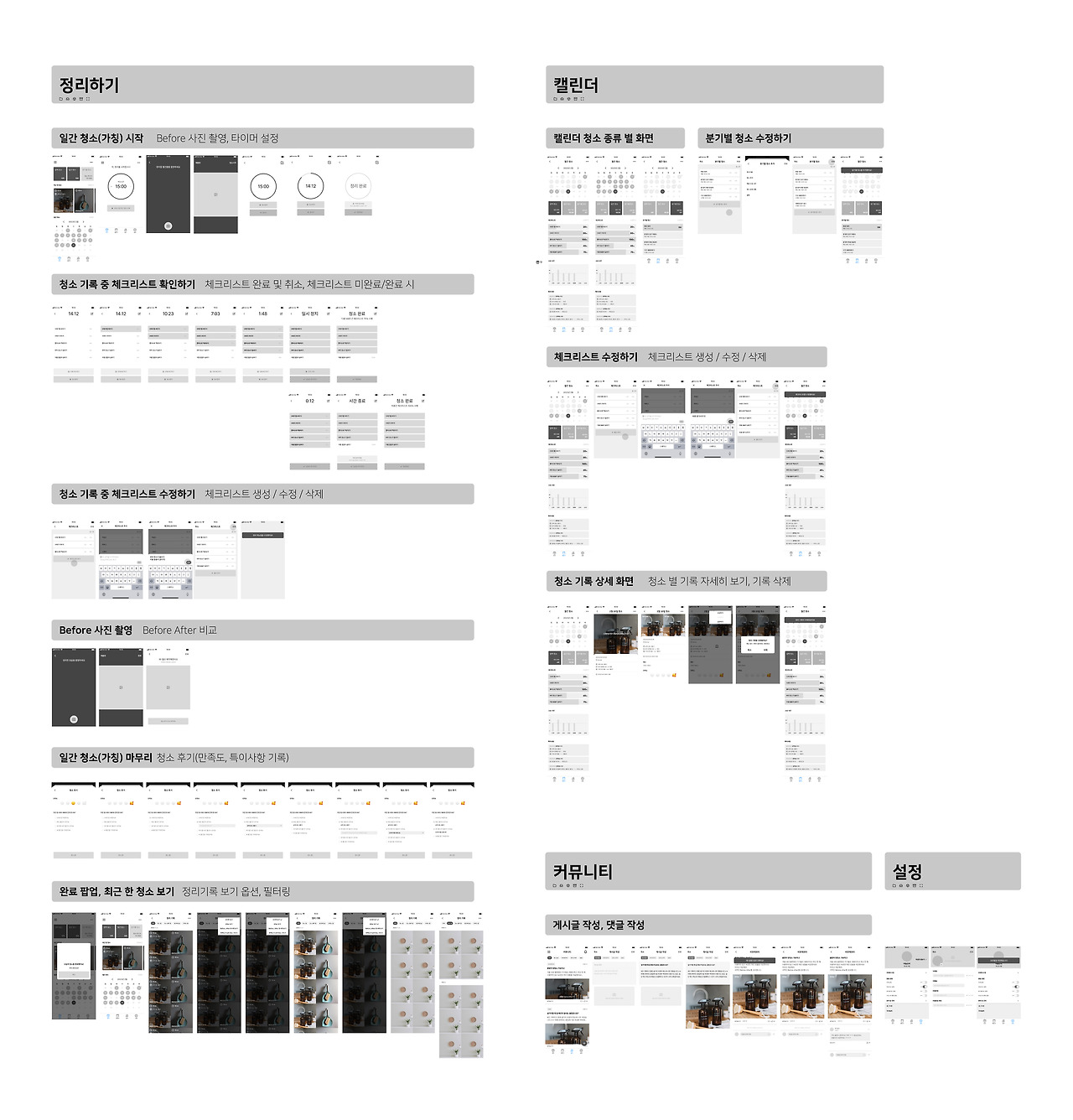 더 자잘하게 쪼개면 더이상 와이어프레임 수준이 아닌것 같아 캘린더, 커뮤니티, 설정 탭의 스크린들은 적당히만 그렸다. 캘린더 탭의 스크린은 한 번더 다듬고 싶긴 하다.