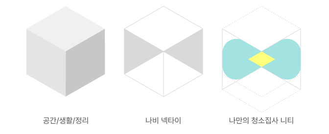 모듈에 쓰인 정육각형은 공간, 생활(대부분의 가구들이 직육각형 프레임에 들어간다), 정리(수납상자)를 상징한다.