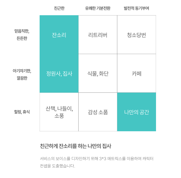 가로 세로에 원하는 컨셉을 각 3가지 씩 써넣고, 각기 연결되는 칸에는 두 컨셉이 상존하는 오브젝트를 쓰면된다. 이것을 메타포로 하여 로고나 캐릭터를 디자인하면 된다.