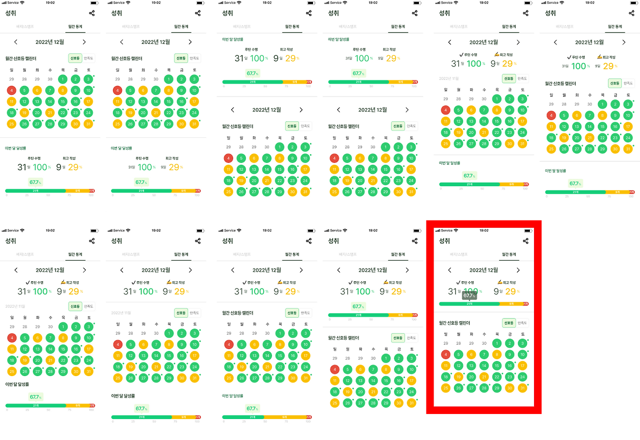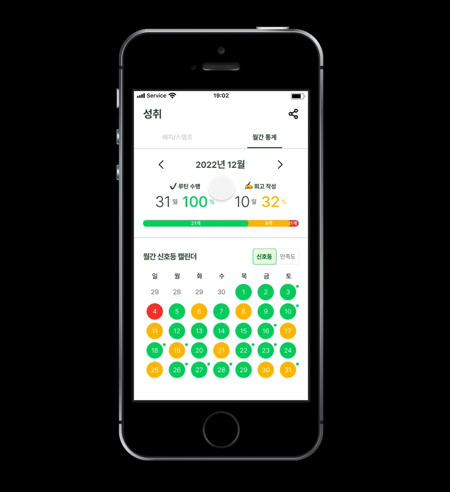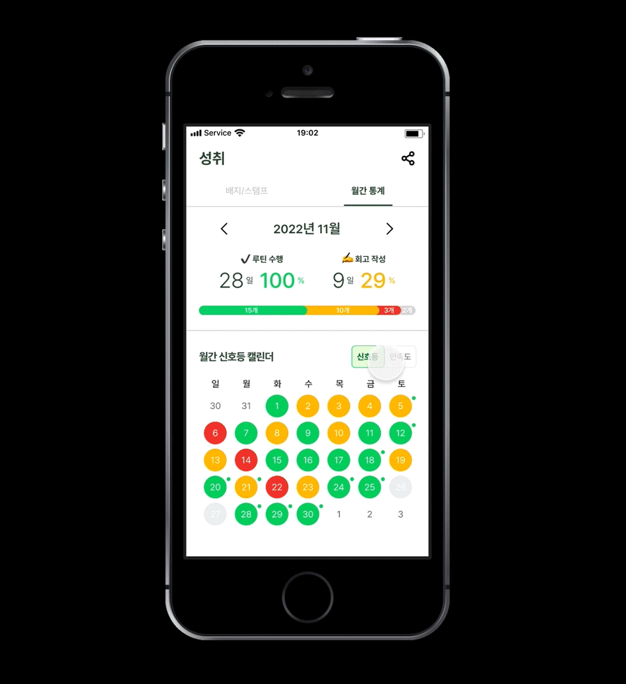 대신 이전 달과 성취도를 비교하기 쉽도록, 달성율 그래프와 캘린더를 스크롤 하지 않고도 한 눈에 볼 수 있었으면 했다. 결과적으로 신호등 달성율 bar의 툴팁을 터치 시에만 보이도록 하여 높이를 최대한 줄였다.