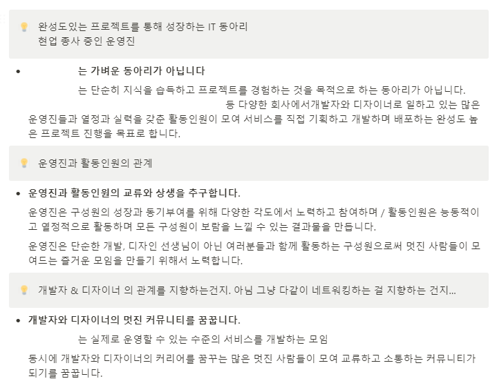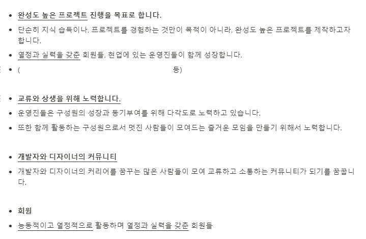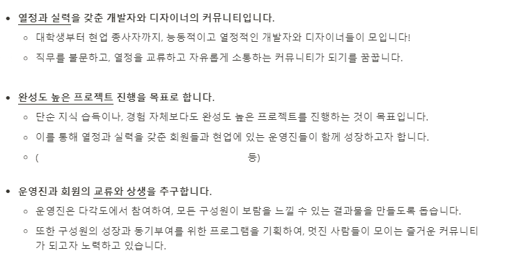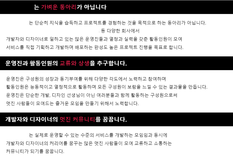 일단 IT 동아리임을 예상 독자들을 알고 있을 것이다. 또 일반적으로 IT 동아리는 개발자와 디자이너의 커뮤니티이기 때문에, 어떤 커뮤니티인지에 대해서 추후 내용을 보충했다.