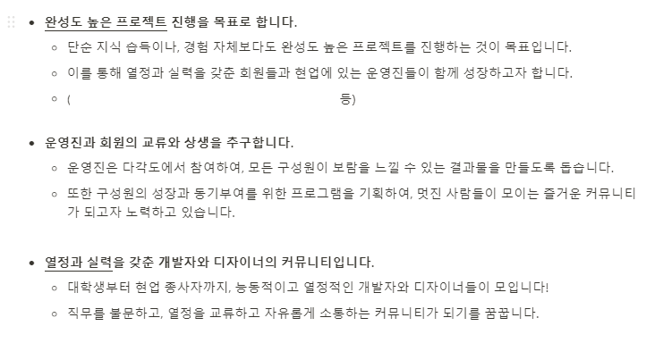 어쩌면 웹사이트에서 가장 먼저 읽게 될 장문의 텍스트인 동아리 소개문은 동아리에 지원하려는 개발자, 디자이너들이 예상 독자인데, 내용이 길고 목적이 잘 드러나지 않아 아쉬웠다. 이 김에 한 번 편집해보자.
