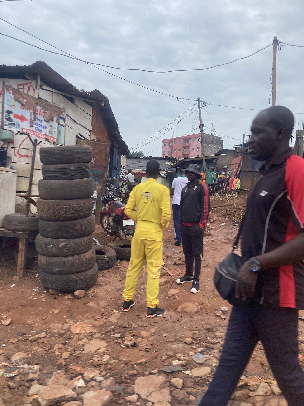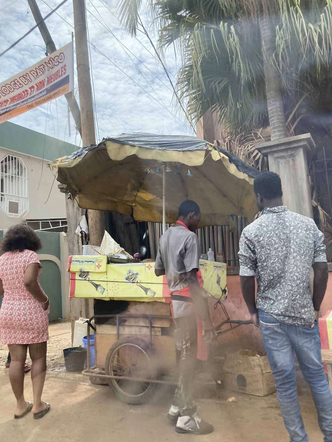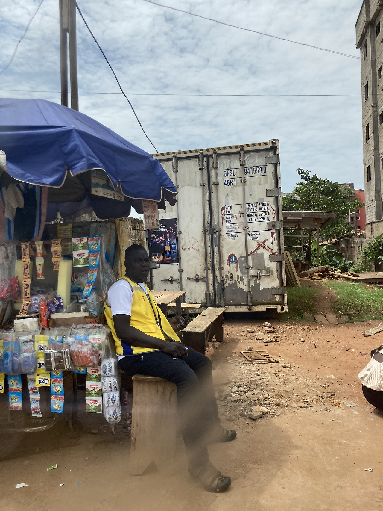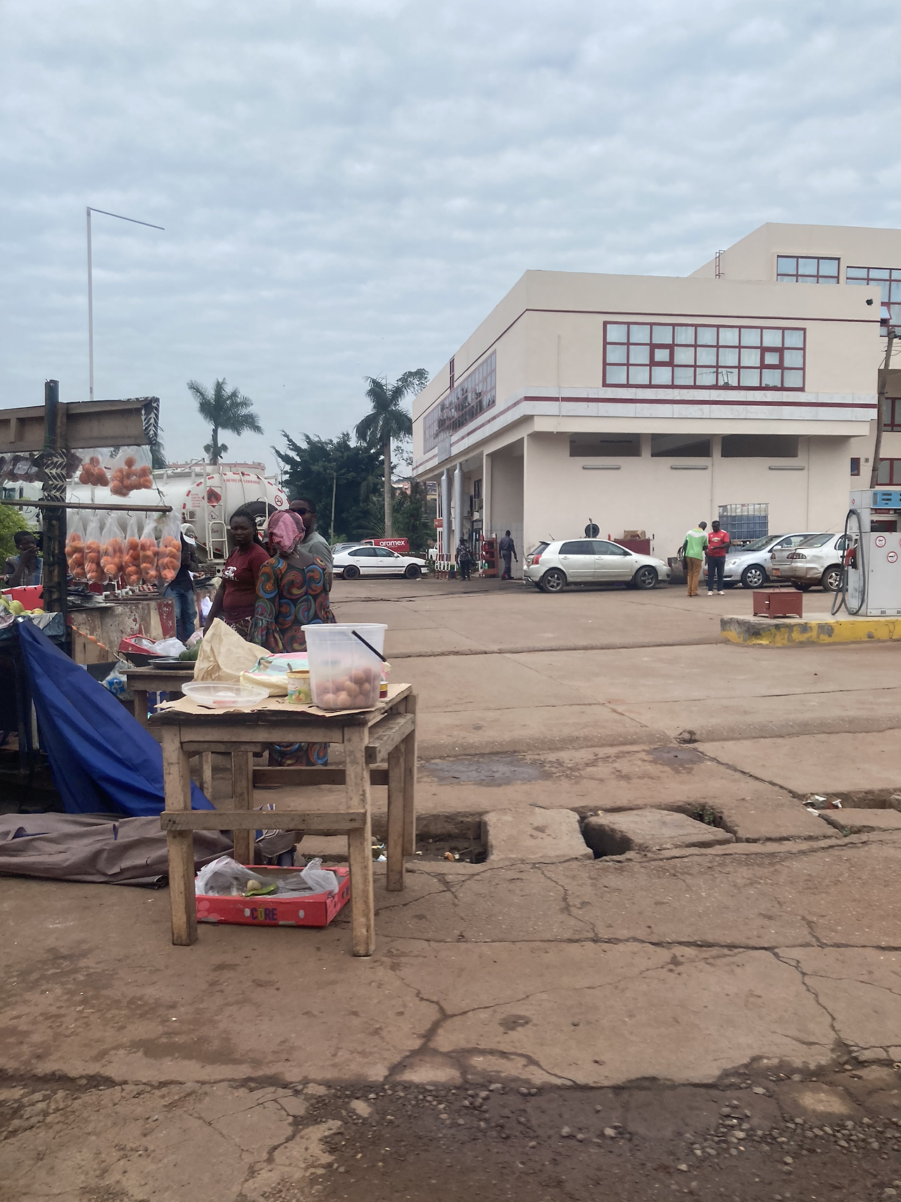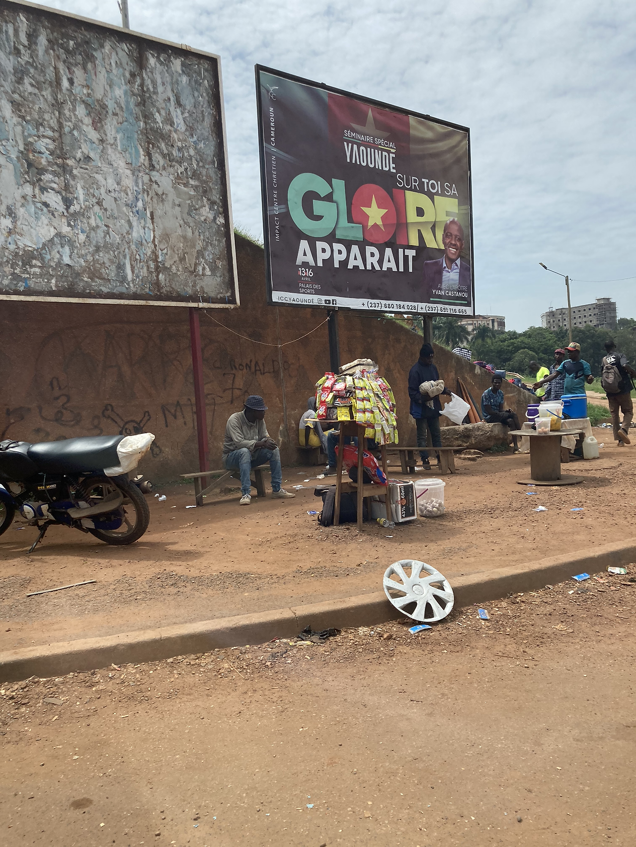 이전에도 많이 이야기했지만 길에서 걸어 다니며 물건을 파는 사람들이 많이 있다. 계란이나 꼬치 같은 것을 이고 다니며 판매하는 여성분들도 많고 CD 같은 것을 들고 다니는 분들도 많이 있다. 아래 사진의 오른쪽에 있는 노란 옷은 이곳에서 경비일을 하시는 분들의 옷이다. 카메룬은 어떤지 모르겠지만 케냐에서는 실업률이 높아서 대학원 석사까지 하고도 경비일을 하는 사람들이 많았다. 점점 치안이 안 좋아져서 경비산업이 발전하고 있었기 때문이다. 카메룬도 많은 경비일을 하시는 분들을 볼 수 있다.