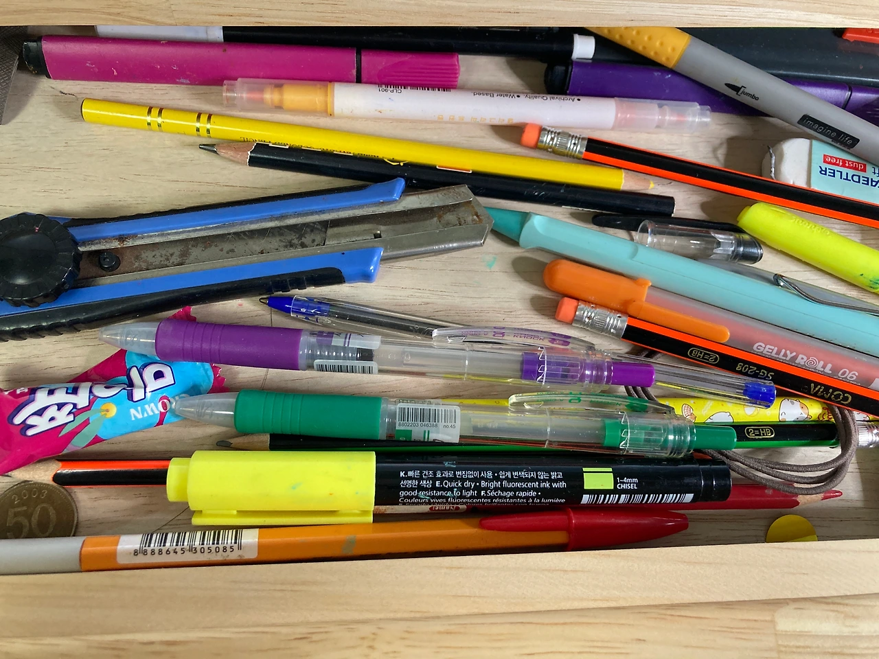 오늘은 수많은 펜들을 꺼내놓고 그어보며 정리를 했다. 그러면서 쓰는 펜은 딱 하나면서 왜 이렇게 펜이 많은가 반성한다. 한때 필기구에 정신이 나가서 얼마 안 한다는 핑계로 몇만 원어치씩 구매했었던 나를 반성한다. 그러면서 스티커들이 잔뜩 담겨 있는 박스를 바라본다. 스티커와 다이어리 꾸미기 용품들이 한가득이다. 이건 어떻게 시작해야 할지 감도 오지 않는다.