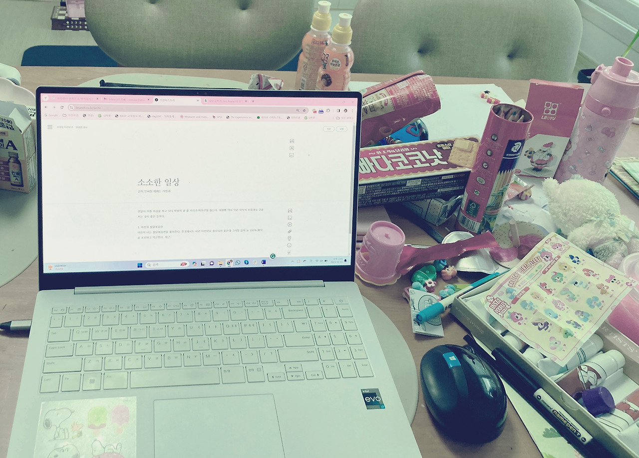 한참 일을 하고 나오니 거실 식탁이 정말 혼돈의 카오스이다. 아이가 혼자 놀아준 것만으로도 감사해야 하지만 일단 한숨 좀 쉬고 짐을 한쪽으로 밀고 노트북을 올려놓는다. 글 쓰는 공간과 일하는 공간은 가급적이면 분리하려고 하는 편이다. 글은 즐거움을 위한 것인데 일하는 책상에서 쓰면 왠지 일처럼 느껴져서 그렇다. 하는 일이 번역 혹은 교정 등 글을 다루는 일이라서 브런치 글마저 책상에서 쓰면 왠지 더 일이 늘어난 느낌이 들기도 한다. 이전에도 말했지만 글쓰기는 마지막에 마지막까지 즐거운 일로 하고 싶다.