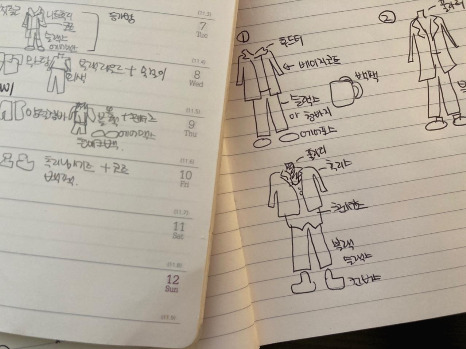 캘린더 가득한 미팅 일정을 확인하자마자 나는 쇼핑몰 앱을 열었다. 옷 쇼핑을 시작했다. 최소한 착장을 5개는 맞춰야 회사 다니면서 아침마다 스트레스를 받지 않을 것 같았다. 플래너에 그림을 그리고 기억을 더듬어 서울 엄마 집에 있는 내 옷들을 떠올려보았다. '그 코트는 입을 만 한가' '이런 바지가 있어야 하나''아 신발도 없는데' '가방을 하나 사야겠다' '숏 패딩이 유행이라는데 하나 살까' 참고로 나는 3주 정도 한국에 있을 예정이다. 한두 번 입고 말 패딩인걸 분명 알면서도 아직도 장바구니에 담아두고는 지우 지를 못하고 있다. 그 외에도 나는 미용실에 가서 할 머리를 미리 정해두었고 얼굴에 바를 톤 업 크림도 귀걸이도 미리 쿠팡으로 주문해서 엄마 집에 배달시켜놓았다.