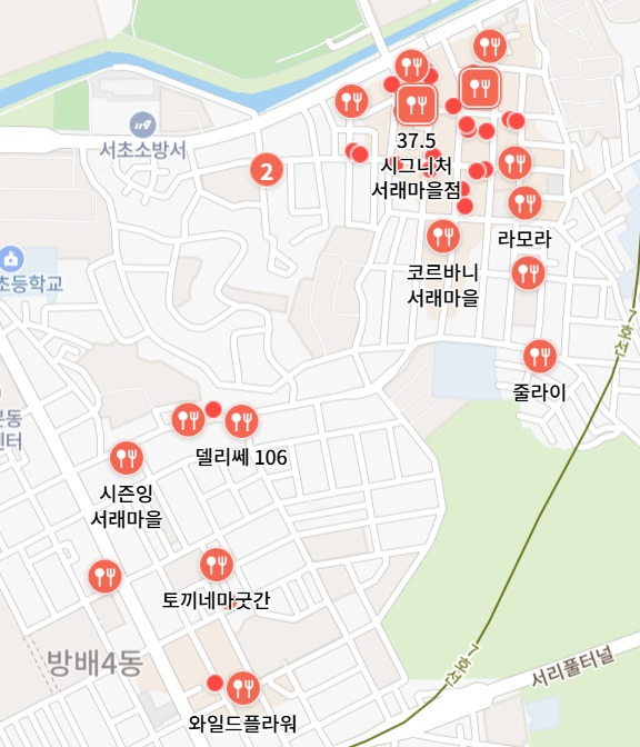 결혼 초기에 서래마을이 아닌 다른 곳에 살 때에 남편이 저기 보이는 '줄라이'를 예약해서 갔었다. 유명 쉐프님이 운영하시는 정통 프랑스식요리를 맛볼 수 있는 곳이었다. 함지박사거리에 위치한 델리쎄, 도우룸, 그리고 카페거리의 여러 레스토랑들. 모두가 한결같이 가고 싶은, 가볼만한 곳으로 가득하다. 진심 없이 생겼다 없어지는 그런 가게는 거의 없다.