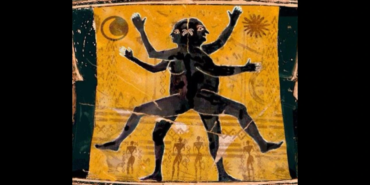 머리 하나에 얼굴은 앞뒤로 두 개, 팔다리는 네 개씩 사방으로 나고 암수 성별을 모두 지닌(Androgyne) 완전체였다. 거침없이 달렸으며 무엇이든 해냈다. 신에 맞먹는 초인적 힘이니 마침내 신의 자리를 넘보기에 이른다. 오만은 벌로 다스릴지어다. 격노한 제우스 신이 번개를 내려 인간을 둘로 쪼개 버렸다. 머릿수가 배가 되자 제물도 배가 되니 신이 보기에 좋았다. 또 신은 하나의 저주를 걸었다. “평생 나머지 반쪽을 찾아 헤매어라.”