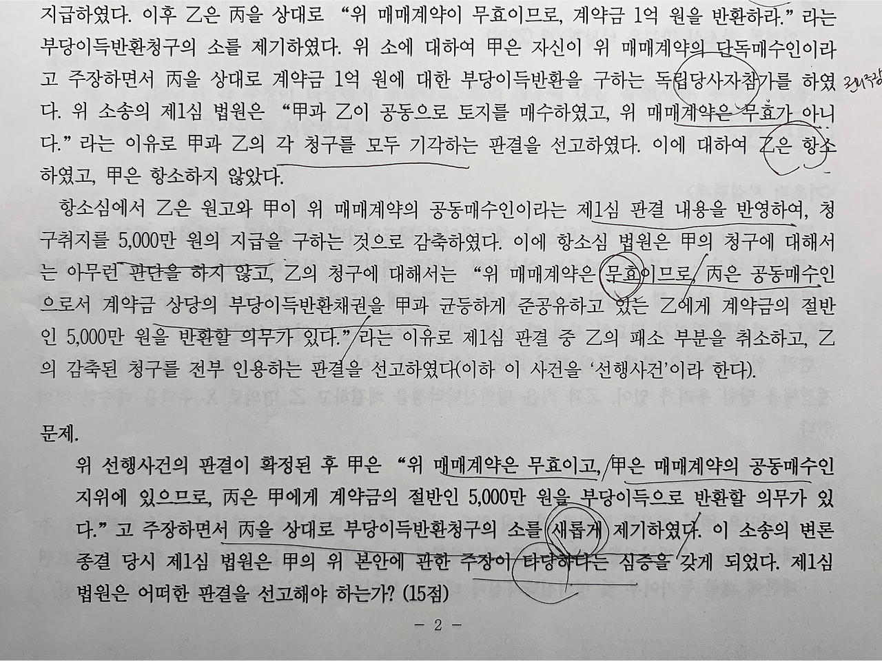 민사소송법이 쟁점 잡기가 까다롭다. 기판력 문제는 재소금지, 법정소송담당, 공동소송에 실체법 쟁점까지 한꺼번에 들이닥치면 마구잡이로 쓰게 된다. 상위개념 일반론은 줄이고 문제 되는 판례의 판시사항대로 목차를 배분해야 된다. 아는데, 알고 있지만. 이번엔 작용국면에 모순금지설에 엉뚱한 썰만 달달 풀고도 최신판례의 결론을 틀려서 바보짓을 했다.