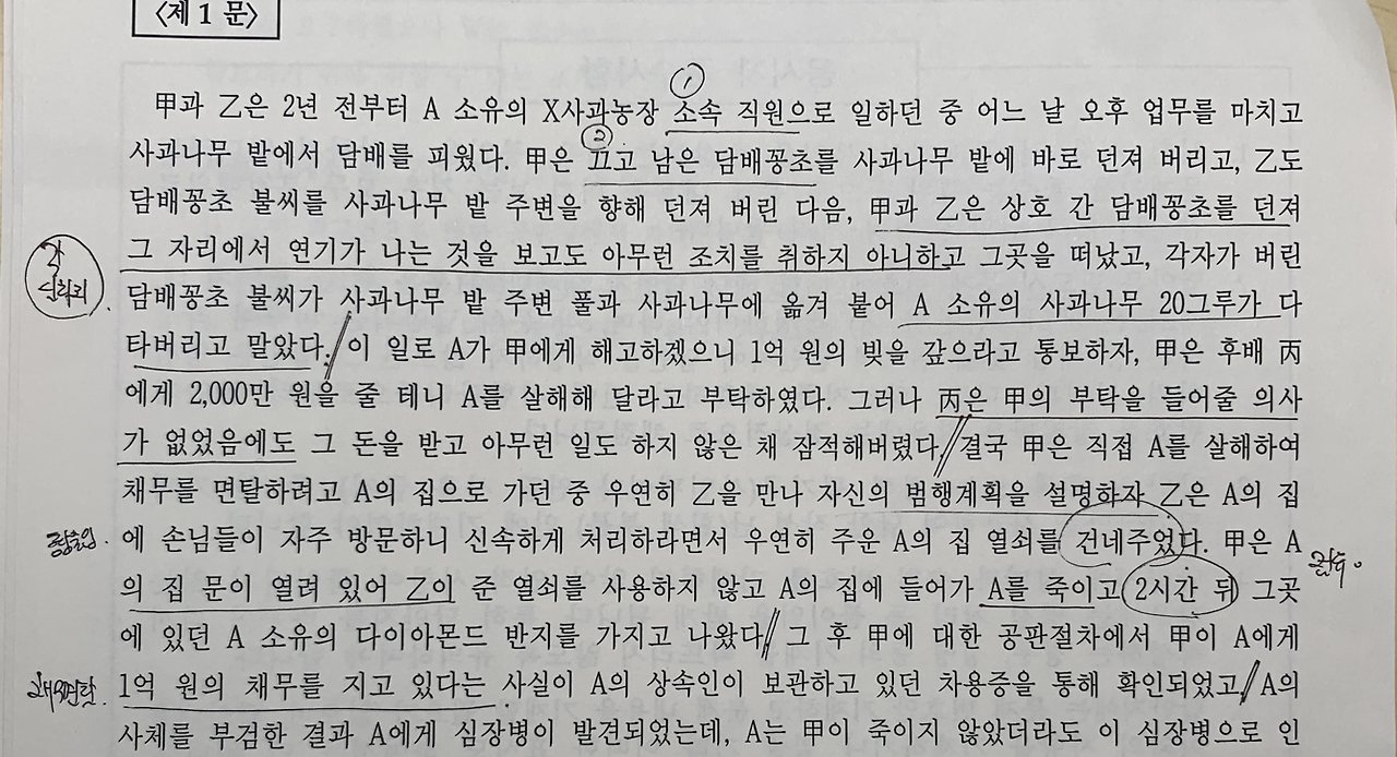 마지막날에 채점기준표가 올라오자마자 예의 있게 정자세로 앉아서 읽었다. 사례형 문제는 쟁점을 누락하거나 논리가 빈약해서 점수를 깎인다. 득점 키워드가 정해져 있기 때문에, 민사법의 경우는 210분 동안 약 1만 7천 자를 써내야 하는 무아지경 속에서 쟁점만 잘 골라내 똑똑하게 써야 한다.